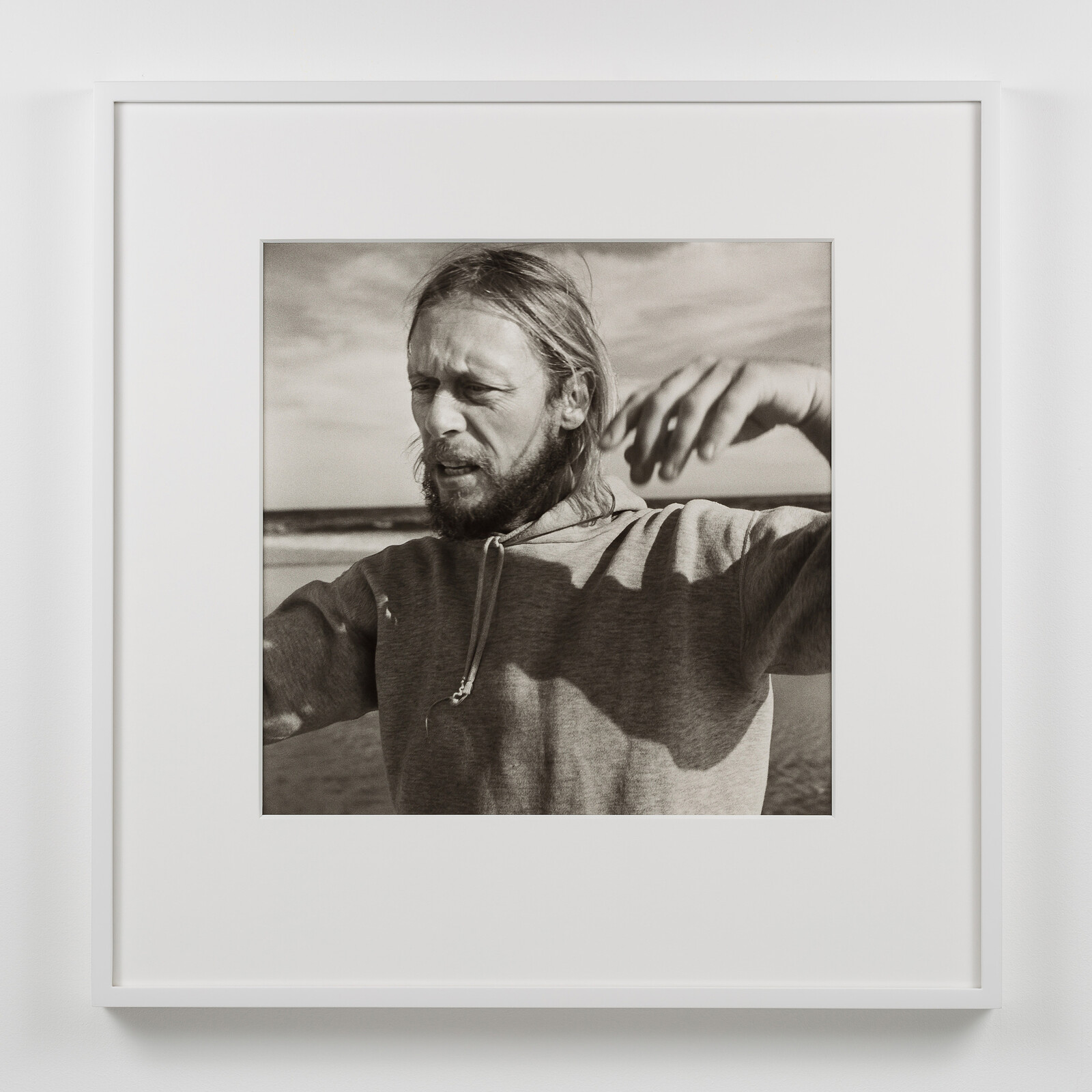 That the 1975 portrait of Paul Thek is placed at the end of the show seems important in this regard. It is slightly anomalous in that it is the closest Hujar comes to something like a decisive moment. Unlike the majority of the portraits, Thek is not quite centered and he does not look into the camera; rather he is captured on the move, mid-gesture, his hands raised, grimacing, apparently trying desperately to express or emphasize a point. He exceeds the frame, pushing against the classical square format that Hujar almost always used. Even the beach, sea, and sky that form the background to the image are not allowed the romantic or existential pathos they would claim if given more space. The image is all about Thek’s energy and presence, and the movement of the dialogue between camera and body, since the composition invites one to read it as having been shot mid-conversation, with Hujar walking at Thek’s side. It is an image that speaks to the affective complexity of their relationship, and of the emotional and psychological difficulties by which Thek was afflicted, but it is also saturated with the living, expressive, individual being. If these images are political then it is in the following way: that they say of their subjects that they want them to be.