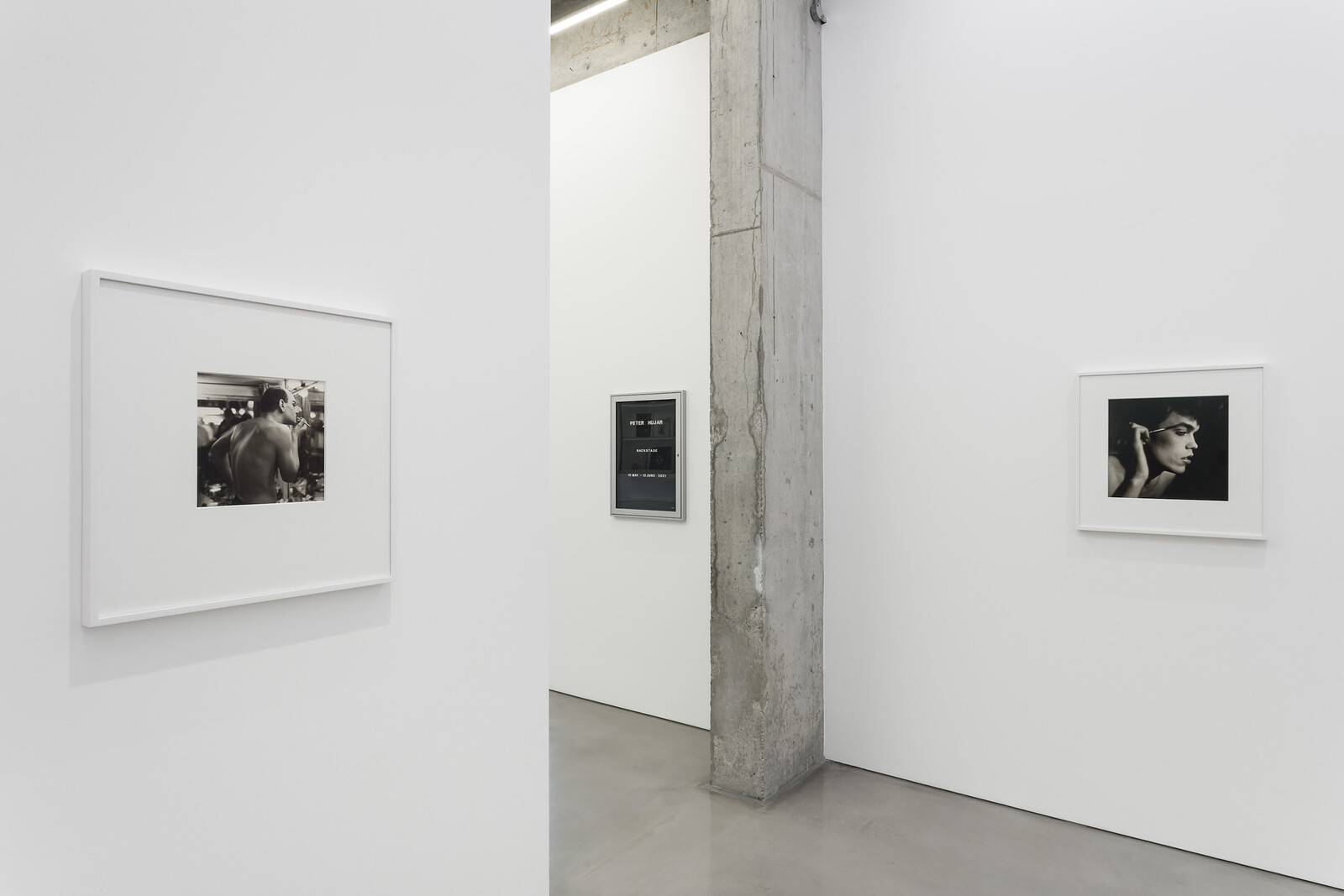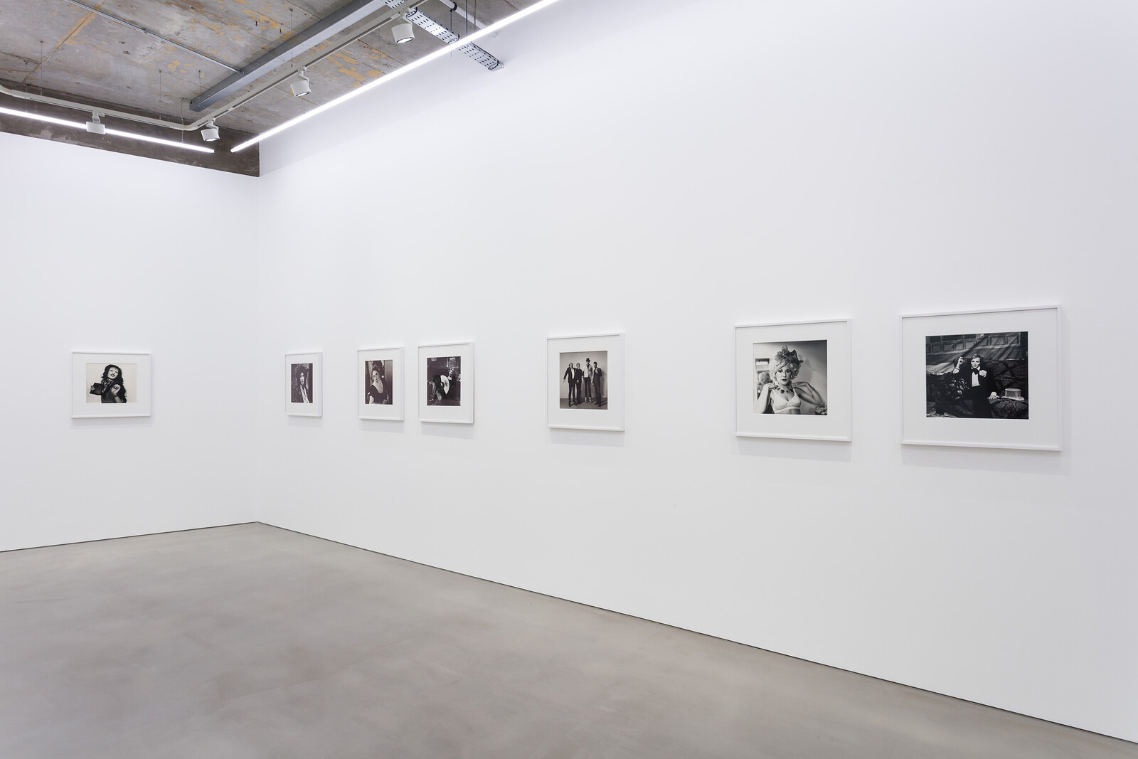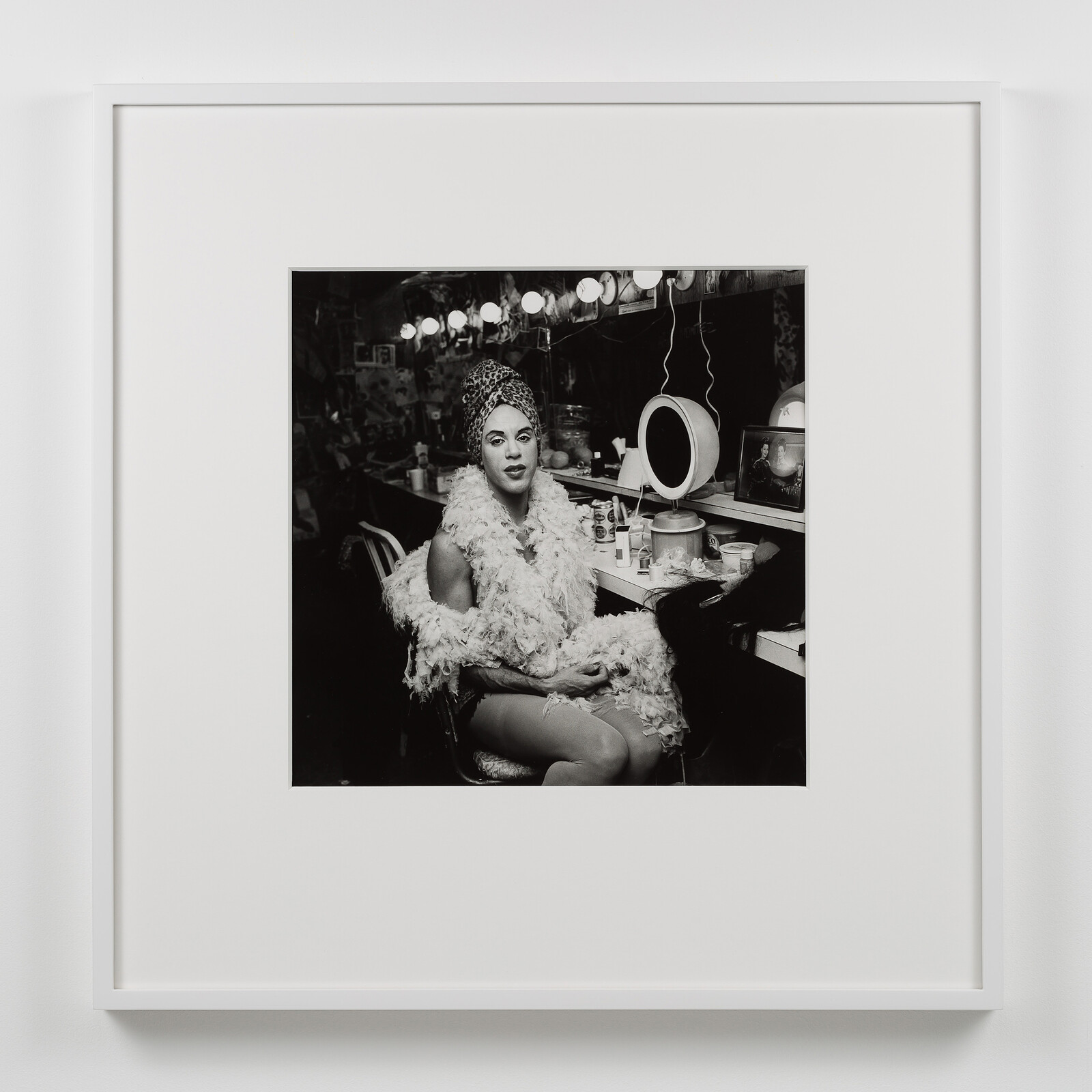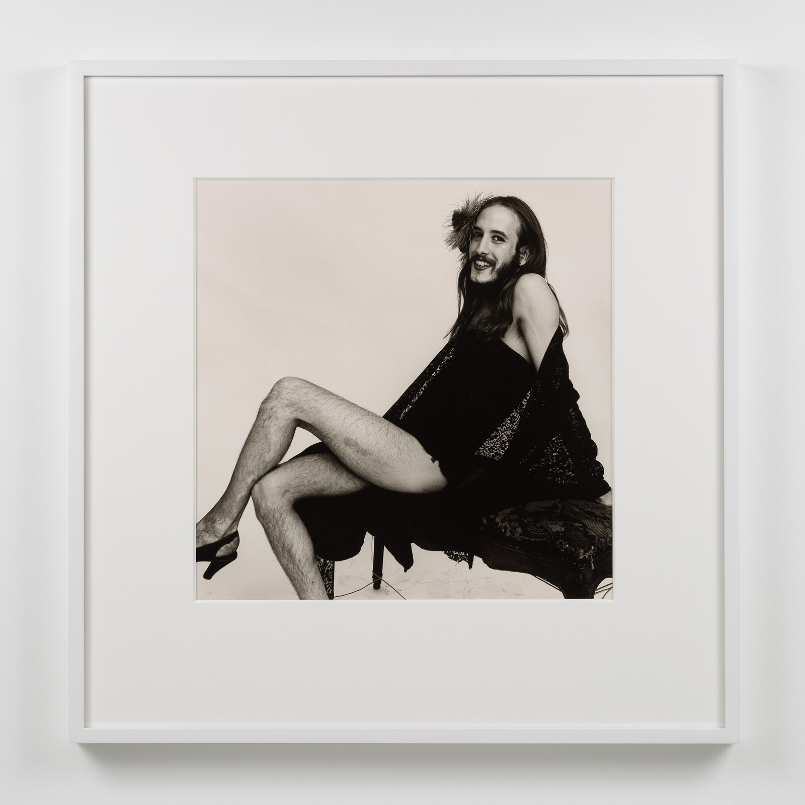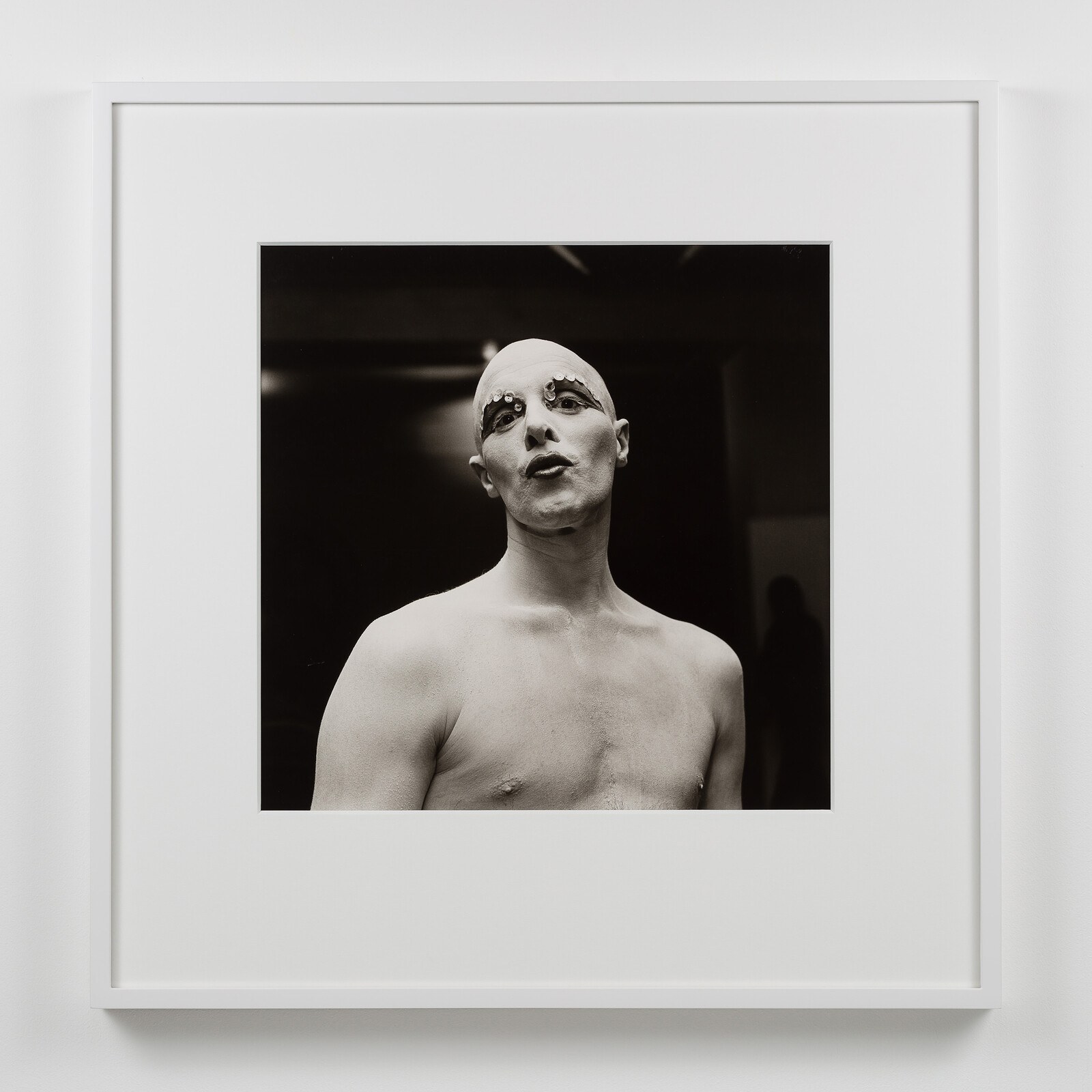 “Backstage” is the third solo exhibition of Peter Hujar’s work to be presented at Maureen Paley’s London space since 2008, when the gallery took responsibility for the artist’s estate in the UK. The work is presented across two rooms; a larger space that almost exclusively shows portraits of artists from New York’s thriving drag performance scene of the 1970s, either preparing their costumes and make-up or gloriously composed backstage. These silver-gelatin prints were made by Hujar himself, with three exceptions: a portrait of the filmmaker John Waters, another of his muse Divine, and a group self-portrait showing Hujar jumping in the air with friends. These are all estate ink prints made by Gary Schneider, the artist and master printer trained by Hujar and now widely regarded as one of the finest printmakers alive. He is also the only printer authorized to make editions of Hujar’s work.