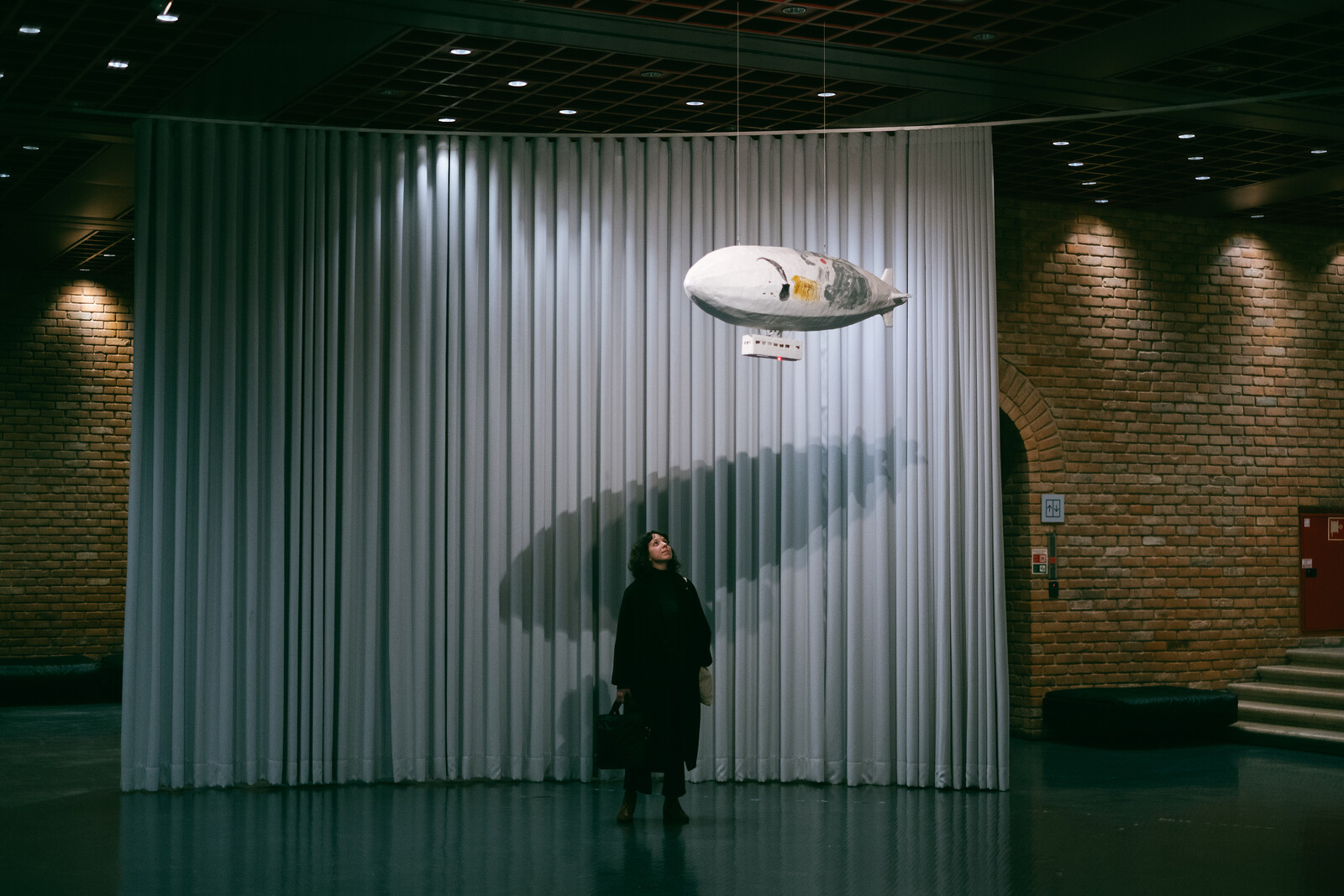 In many of Peter Wächtler’s video works, nothing much seems to happen. In Untitled (Vampire) (2019)—one of four such works on show alongside a series of gesso and bronze sculptures of planes and animals in his first exhibition in Portugal—a Nosferatu copycat, living within the dusty and humid confines of a mountain castle, spends his time writing letters to be delivered at the nearby village; kisses his undead wife on a balcony at night; sleeps with his arms folded over his chest; then goes back to writing letters. In 2013’s animation Untitled (Rat), an anthropomorphic rat repeatedly wakes up in its bed, leaves, presumably goes about its life, and returns back home in the evening. All we are offered by way of context is a single, hand-drawn shot of the rat’s proletarian room. In 2018’s Untitled (Clouds), a quirky dragon with a cutesy straw hat flies about a landscape reminiscent of Conan the Barbarian. In Like a Palace (2022) a group of time travelers hop between epochs—the Stone Age; Ancient Greece; the Industrial Revolution; Late Capitalism.