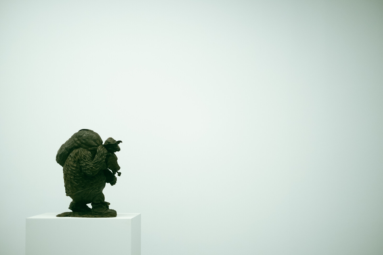 Perhaps it’s this emotional rawness that makes Wächtler’s show so frustrating. The installation itself felt incredibly plain and austere, with little to no care for light design or the sensorial quality of materials. While the videos have their own particular power to make one forget one’s whereabouts, the sculptures suffered from this choice. These consisted mainly of gesso airplanes and a set of anonymous busts, exhibited without much curatorial contextualization, and a small set of bronze sculptures of anthropomorphized animals: a bear with a pipe and a sack on his back; a bat in a hat, operatically bowing. Frozen in time, their actions reminded me of illustrations from fairy tales or old Disney cartoons, and while the link with the videos was there to be made, their bare installation did not provide an exhibition environment conducive to richer world-building by the viewer. Sitting in those rather inhospitable-feeling galleries, with their gray linoleum floors and acid-white walls, I left the exhibition wondering if its coldness was a product of its installation rather than the works themselves.