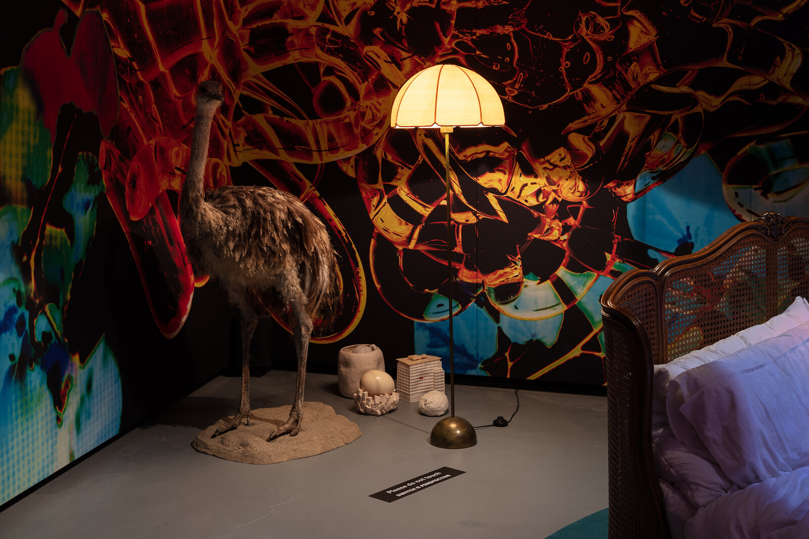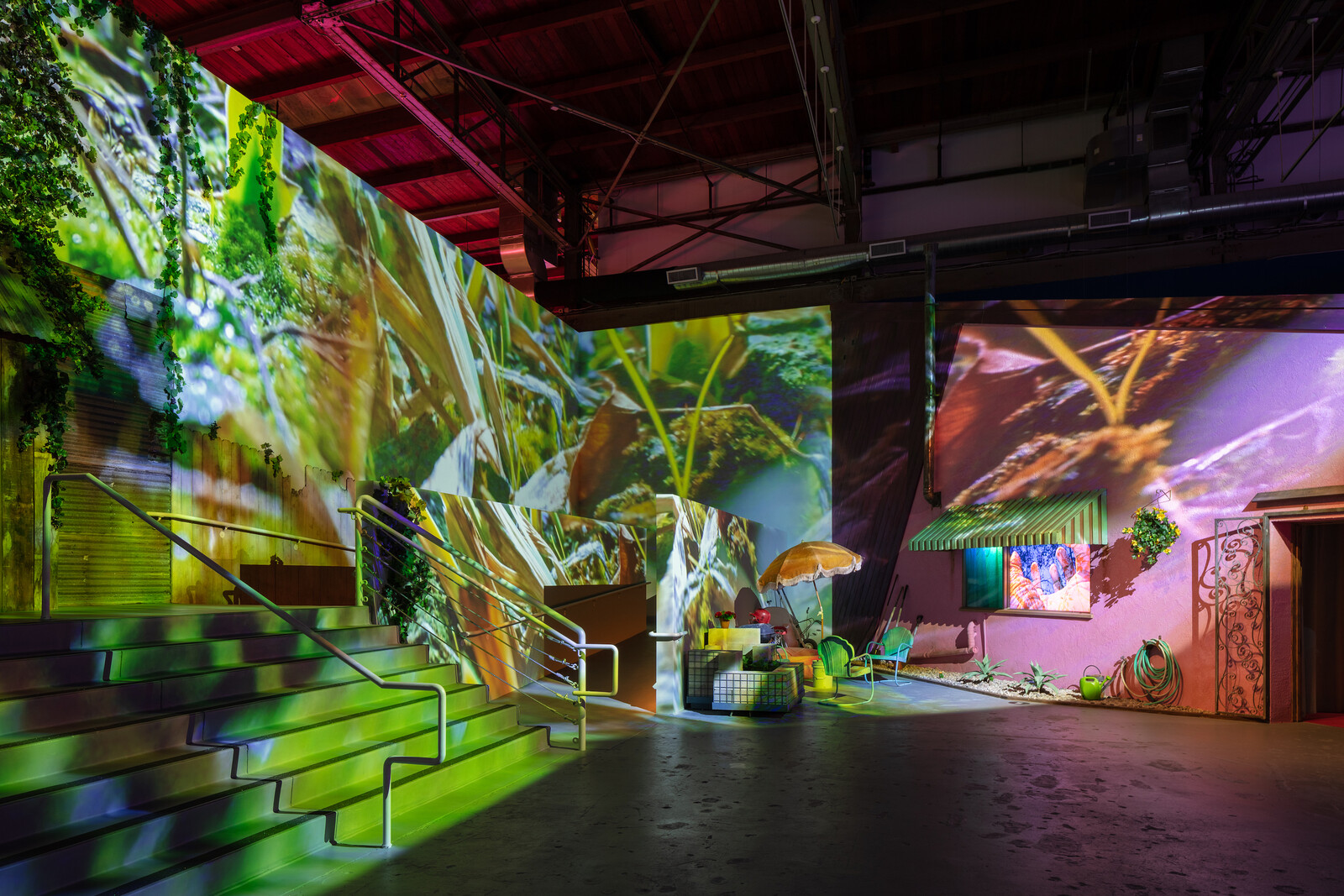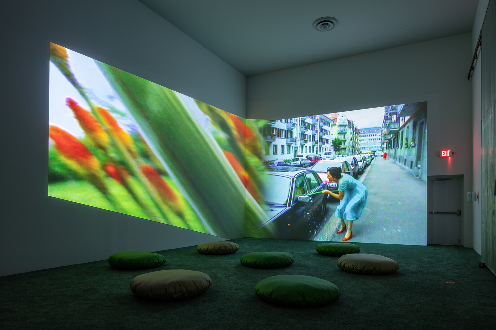 The neighborhood is anchored by two, maybe three sites. The first, to the left after the entrance, is “The Apartment,” a self-contained interior space filled with numerous works made between 2006 and 2019, many of which incorporate actual furniture and objects into tableaux. Couches, tables, and just enough clutter scattered around provide the requisite comfort of home. The second, to the right, is the aforementioned communal grounds; an “outdoor” space in and on which the newest works (for example, Neighbors Without Fences and Neighbor Understand on the Ground, both 2021) are projected on the exterior walls and grounds. And, then, maybe, there’s Pixel Forest Transformer (2016), one of Rist’s hanging LED “gardens.” I say “maybe” because this installation is more “non-site” than site, given how the shifts in color across its thousands of floating lights effects a pixel-by-pixel dematerialization. This transformational space moves us back to Rist’s earliest work, including Das Zimmer [The Room] (1994), a funhouse version of a living room in which oversized furniture faces a normal-sized monitor that presents a range of her inventive single-channel videos from 1986-2005.