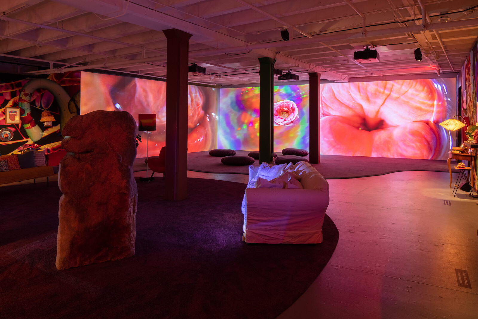 “Stay home.” Where or when does comfort become confinement? Pipilotti Rist’s exhibition in MOCA’s Geffen Contemporary warehouse invites us to take an entertaining, even rejuvenating stroll through Rist’s “neighborhood,” a place provocatively split in two, where the bodies on screens present little to no risk and plenty of reward.