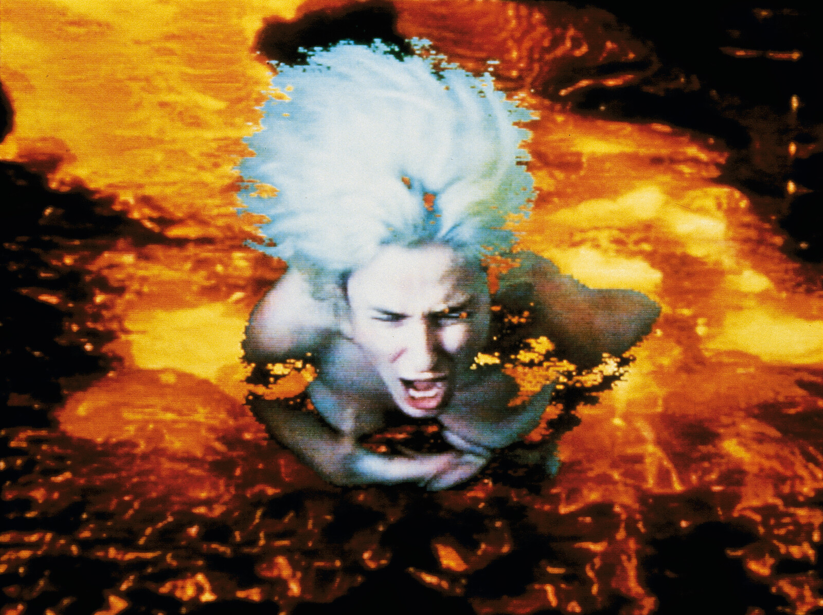 What to do here with one of Rist’s most compelling, most satisfying works? How can it be that Selbstlos im Lavabad [Selfless in the Bath of Lava] (1994) is so tiny yet commands the entire space of this ostensibly big-hearted neighborhood? Why is this shrunken video of Rist with white hair yelling things like “help me!” in several languages while she is being consumed by hellfire here when we first arrive? To say the work is a cautionary tale is an understatement, but we’ll see her again, because we’ll have to pass by her to get out.