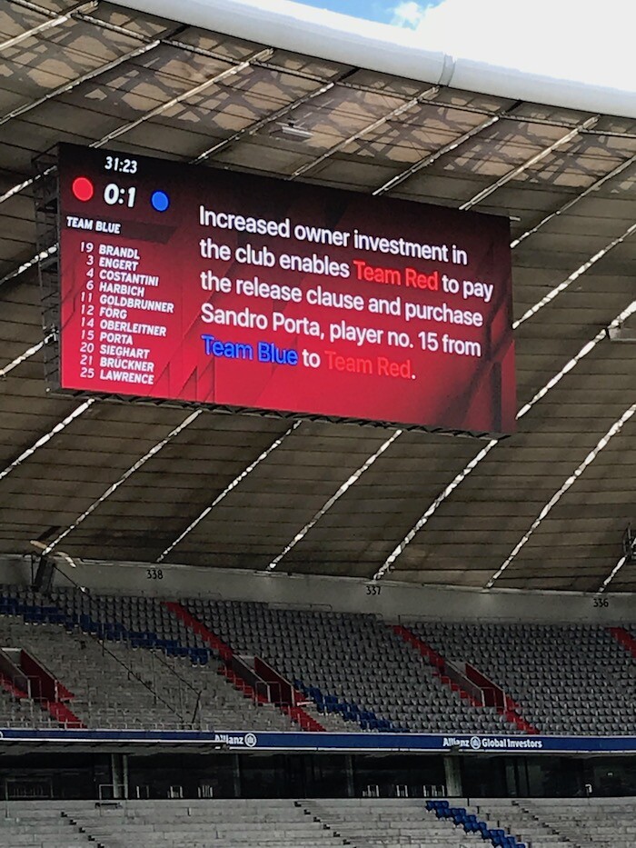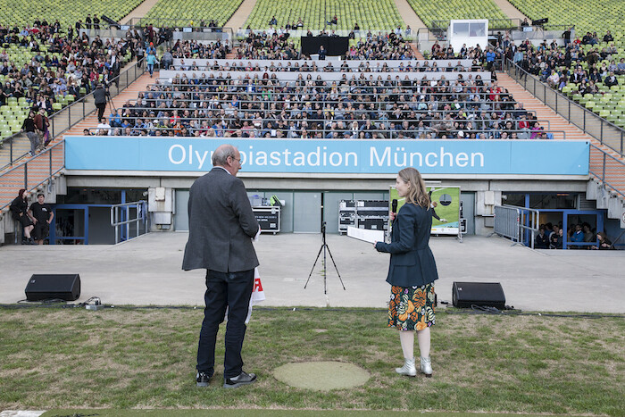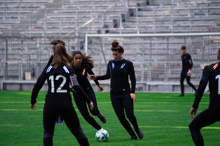 This variety means art is shown in places locals may have never been to—the radio station’s studios, for example, are now the library of the university’s media department; the Amerikahaus is now the Bavarian Center for Transatlantic Relations—or always dreamed of visiting. At the Allianz Arena, home of FC Bayern Munich, who won the seven last German league titles in a row, Jonas Lund and Alexandra Pirici staged N Football, a football game featuring the Bayern youth teams. Divided into two mixed-gender teams, boys and girls from the under-16 and under-17 age groups played a game interrupted every few minutes according to a set of regulations designed by the artists. When a player scored, a “collective credit” appeared on the massive screens, acknowledging the forward who netted the ball as well as those who assisted. It countered the fact that, despite being a team sport, football is largely discussed and represented in terms of individual winners. For about 20 minutes, both teams played on just half the pitch, with one team attacking and the other defending, before switching turns—a comment on the financial discrepancies inherent to football, where global brands supported by oil-rich states and oligarchs can meet local clubs which have no chance of winning unless they play defensively and strike a lot of luck.