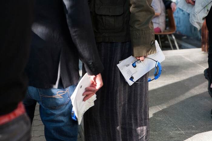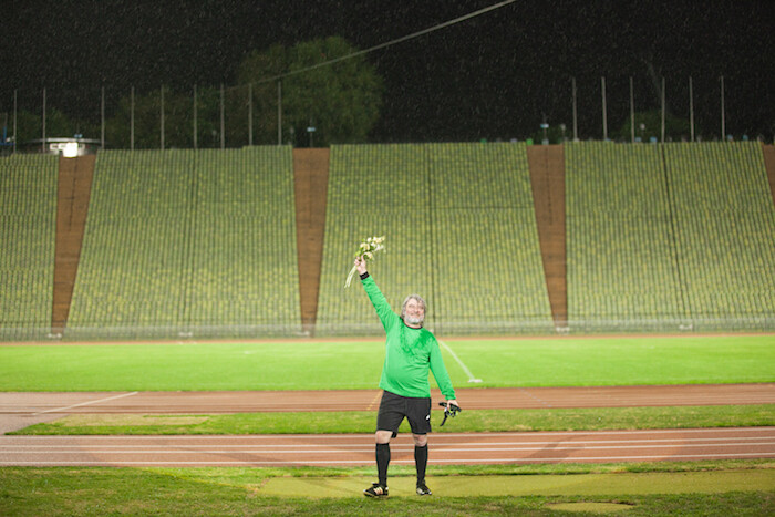 After the match there was a public talk between frieze editor (and football lover) Harry Thorne, the artists, and a number of the young players featured in the work. One of the girls admitted she kept a piece of the pitch’s grass: a reminder of how meaningful a site can be. A few weeks before Football N, there was a PAM performance at the Olympic Stadium. Massimo Furlan organized the reenactment of a game from the 1974 World Cup, in which East and West Germany faced each other in the last match of the group stage, each having already qualified, in a Cold War standoff that ended one-nil to the East. (West Germany went on to win the cup.) In Furlan’s version, A Reenactment of the 1974 East Germany–West Germany World Cup Match, with original commentaries, there were only two players. The artist played Sepp Maier, the West’s goalkeeper, while actor Franz Beil was Jürgen Sparwasser, who scored the winning goal in that fateful game. Maier and Beil played without a ball but accompanied by the original radio commentaries, following a choreography that took place 44 years earlier. At one point, Beil was injured and taken off on a stretcher and a streaker ran onto the field. The audience had no idea where the performance ended and reality began: so many people told me about it that I became convinced storytelling can make a public of you even if you weren’t present.