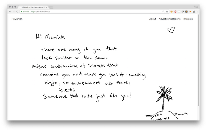 “Hi there, there are 3300 people just like you in Munich, interested in FC Bayern Munich & contemporary art between 13–65 years old,” reads a Facebook ad that is part of Lund’s other project for PAM. Hi Munich is directed at Facebook users in Munich via the platform’s targeted advertising feature. Anyone who would look up the project via its website (https://hi-munich.club/) would also see the advertising reports on how many clickthroughs Lund’s advertisements received after he spent just over €1000 on Facebook ads. These are aimed at audiences divided into such categories as “Contemporary art, Curator, Monthly income higher than 5000 EURO” (only six clicked, from an audience of 18000, of whom 1024 were reached by the ad), or women interested in “Painting, Very Important Person, Contemporary art, Time travel, Vegetarian Cuisine” (648 reached; 20 clickthroughs). To see how Facebook thinks of—and monetizes—users and their interests is to know how you could constitute an audience and recognize some of the stakes thereof. In doing so, Hi Munich highlights PAM’s complex idea of public art— a space where a public recognizes itself as such.