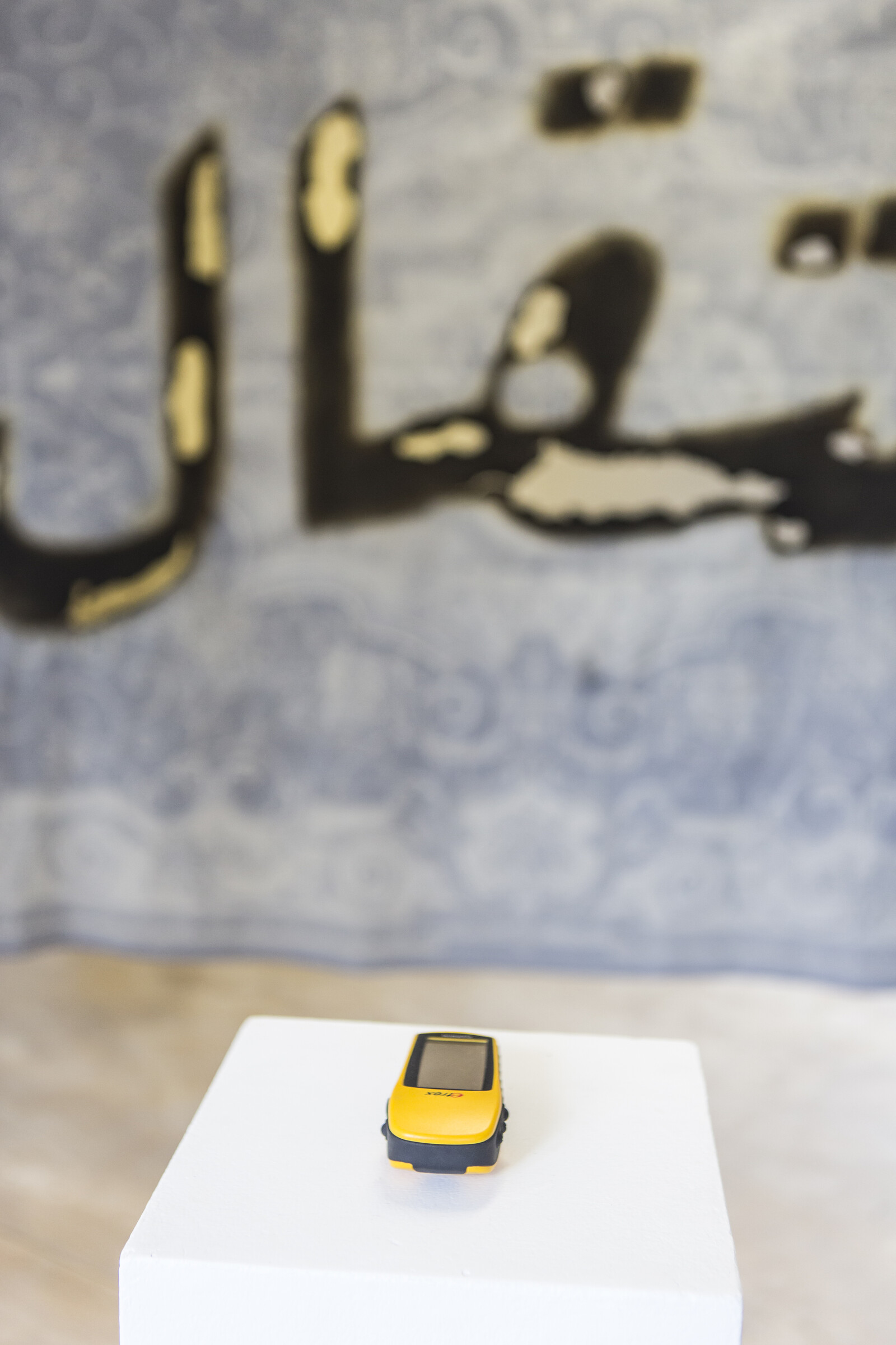 At the entrance to the Centre d’Art Contemporain de Malakoff on the outskirts of Paris, I am met with a mass-produced, generic “Oriental-style” rug into which an Arabic word has been burned, a word which transliterates to inteqaal. It can mean the movement of persons from one country or place to another, or the transition from life to death. It also describes the time when something ends, such as the end of a regime or the end of belonging resulting from immigration and exile. Oran-based artist Sadek Rahim burned the word into the rug—in some places straight through it—by dripping refined petroleum made from Algerian crude oil into its synthetic ground and then setting it on fire. The rug is part of Rahim’s installation Mouvement (2020), which encompasses a slim plinth standing in front of the rug with a GPS Garmin 73 device sitting atop it. This model is the one most used by harragas [burners], the North Africans who destroy their papers and cross the Mediterranean in search of economic stability.