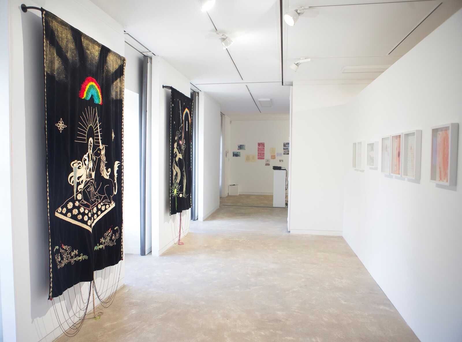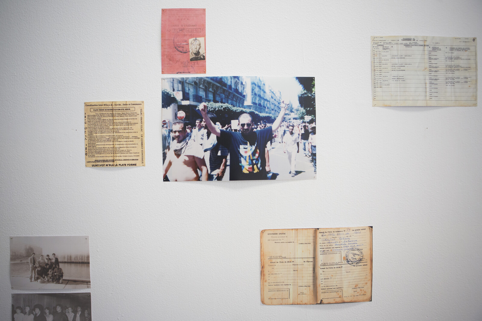 At the top of stairs leading to the second floor, a striking typographic installation by Marseille-based graphic designer Walid Bouchouchi fills an entire wall. Fono-type (2018) is an alphabet Bouchouchi created by fusing Arabic, Latin, and Amazigh scripts that concretizes the créolization of Algeria’s three principal languages. Bouchouchi’s utopian alphabet, constructed with irreverent confidence, proposes the fictive linguistic system as an ideogram for the possibility of inter-community dialogue based on a notion of Algeria as a multicultural society.