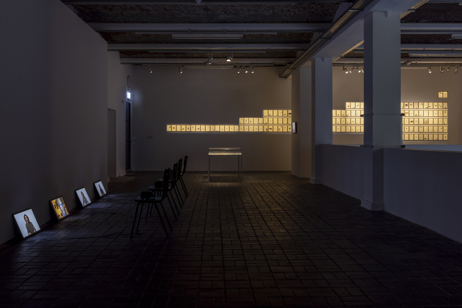 The imposing central work, Images Mon Amour (2021), loops through imagery culled from Lebanese newspapers, with the benday dots of analog print enlarged and visible. Weaponry, tanks, air patrol, bombs, cities, landscapes, and people in various states of pre-war life and post-war devastation are collaged together like geologic strata. Formally, it evokes the contemporary habits of phone scrolling, or even microfiche, the pre-digital news aggregator, and its verticality suggests aerial occupation and the threat of drone warfare. The work crystallizes an overarching position in Mroué’s oeuvre: that, across geographies and generations, through the sediment of time, war permeates life. Technologies of image-making are inseparable from conflict, and always position one as either viewer or viewed, victim or oppressor; that such positions are never fixed is the crux of Mroué’s determinately theatrical and anti-documentary stance.