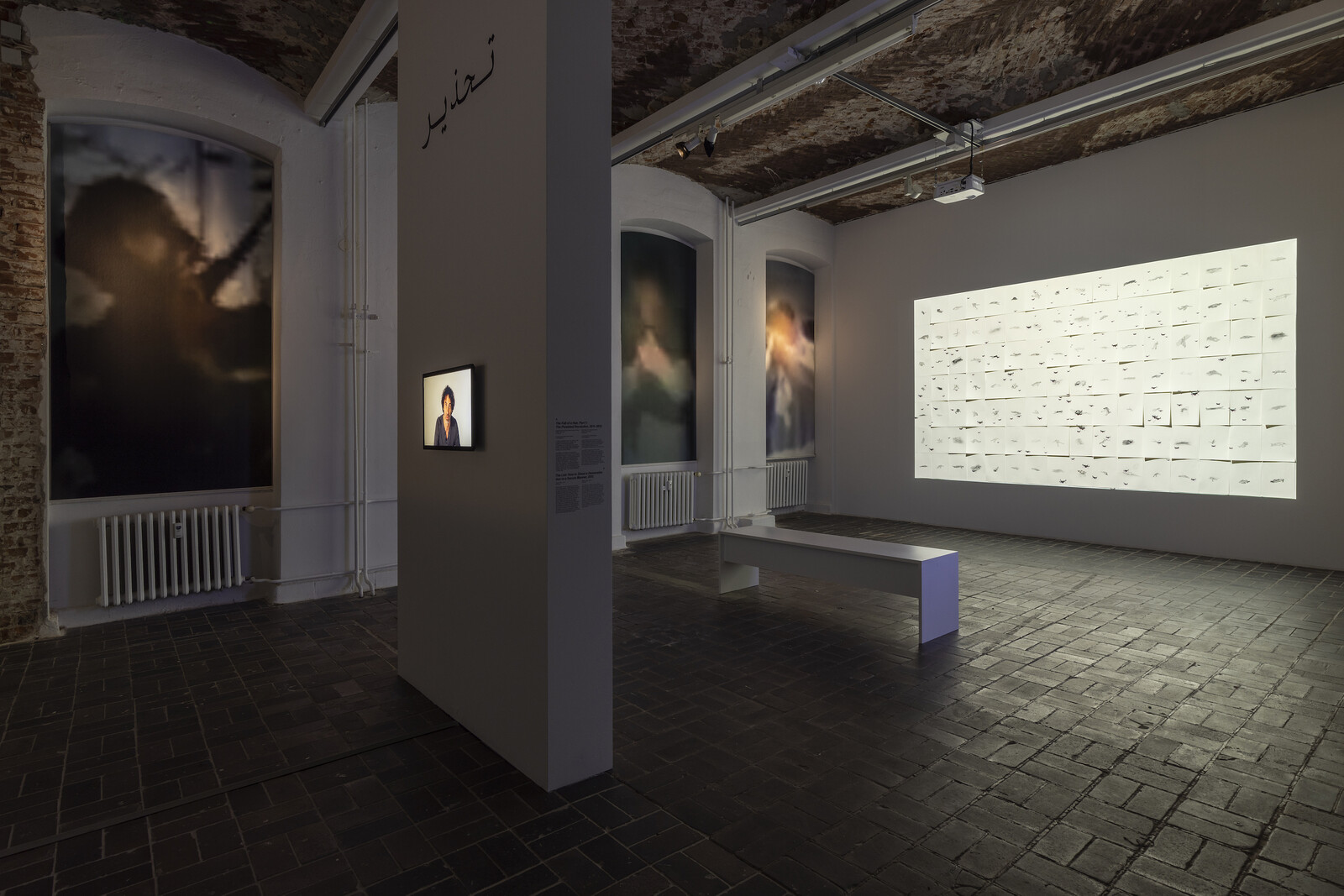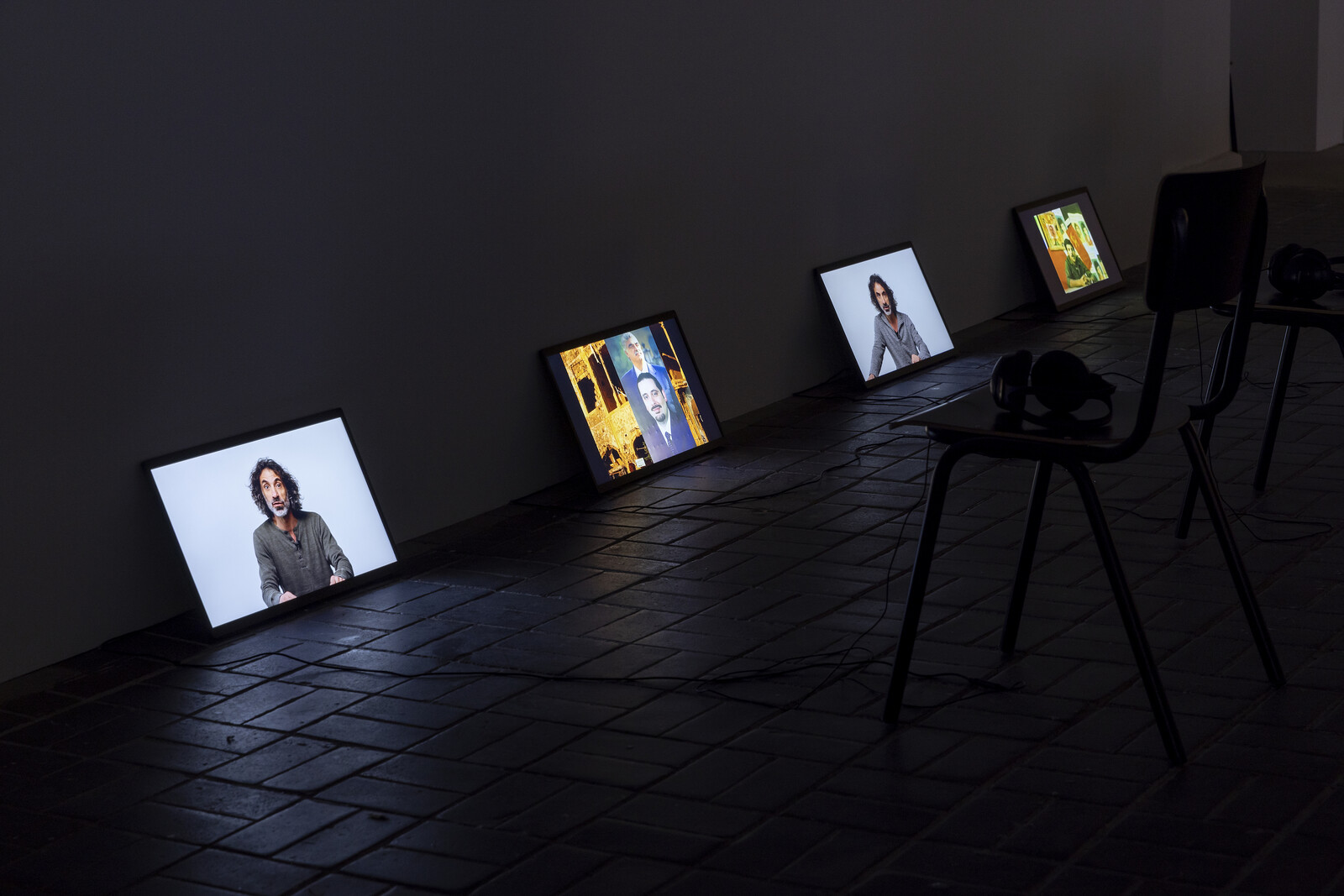Mroué’s careful negotiations of fact and fiction, and his expertise as an actor, are most evident in what he calls his “non-academic lectures,” live performances that take the format of an illustrated lecture while confusing the pedagogical and didactic purposes of one. Winding, looping storytelling creates a world where images are agents, facts are personal, and lines between Mroué the actor, artist, and activist all blur. It was a brilliant move to restage his older performances for video—including the acclaimed “Make Me Stop Smoking” (2006) and “The Inhabitants of Images” (2009)—and exhibit them grouped together, so the present-day Mroué appears to inhabit the ideas and arguments of his former self. One of his most effective confusions of subject comes in On Three Posters (2004). The original performance investigated an unedited videotape of martyr Jamal al-Sati giving different “takes” of testimony to be aired on Lebanese television; at its conclusion, Mroué stepped out from behind the screen, confusing the Beirut audience who assumed they were watching a recording of Mroué, a famous actor, playing the martyr. Instead, in this moment of fabrication, his reanimation of the dead became real: “Who is the spectre, the flesh or the image? I, or my picture?”