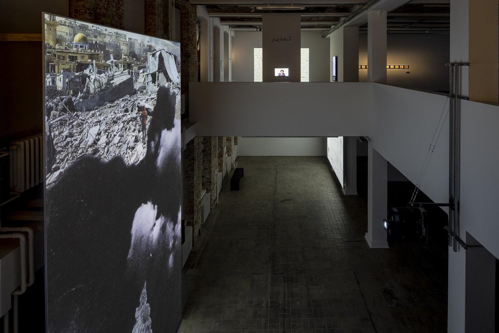 In design and execution, its ambitions are staggering. A non-linear constellation of video projections, installations, collages, and archival material are structured around a two-story vertical video that can be seen from all corners of the exhibition’s two floors. With so many video and audio works, the sound bleeds (a plinky xylophone suggestive of a film score’s anxious denouement, punctuations of gunfire and explosions that arrive unexpectedly, the noisy insistence of a film projector) effectively recall the sonic chaos of war while still creating an integrated audio environment.