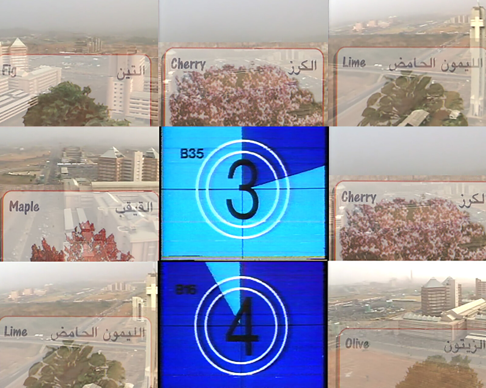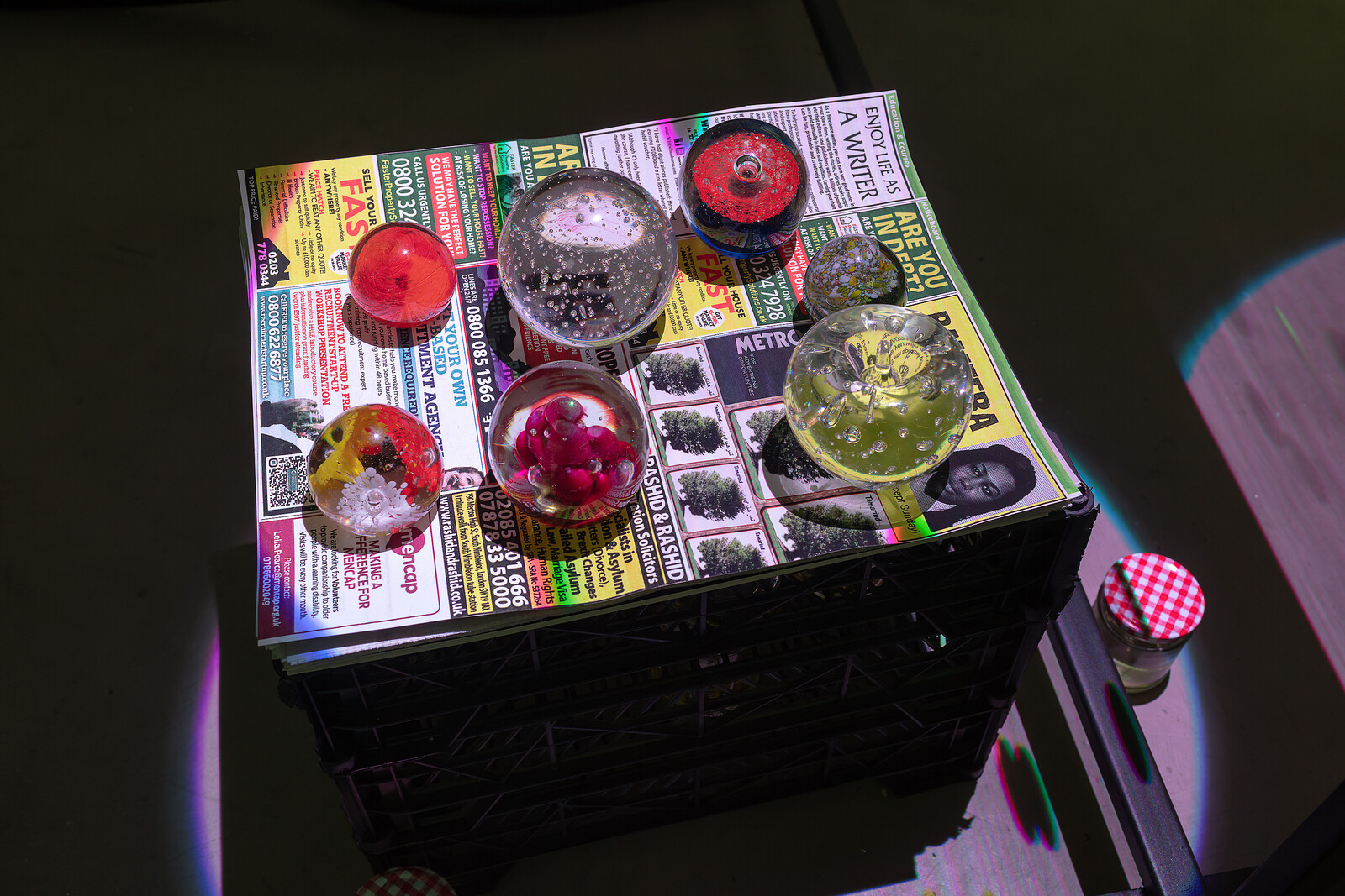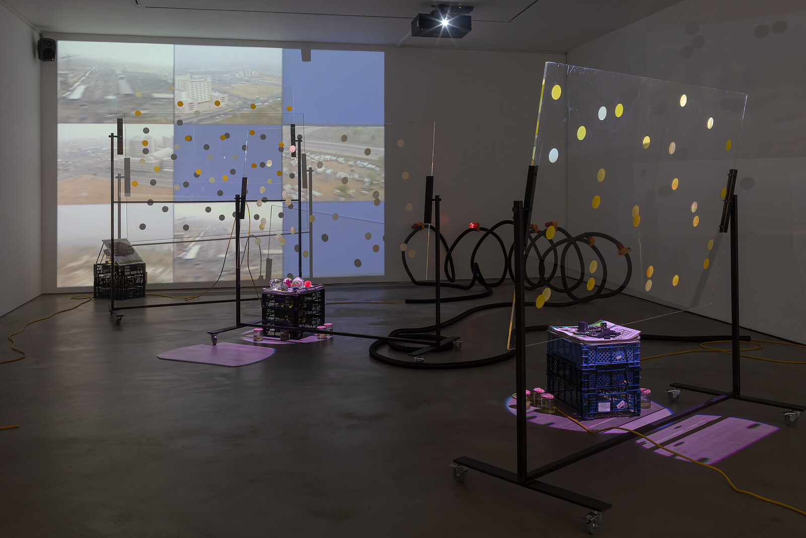 Two projectors play helicopter footage of Abuja, after its inauguration in 1991 but seemingly still under construction, on opposite walls. They each present the clips in a grid of nine channels—laid out like CCTV monitors—that loop on and off out of sync and so animate the dark space with their shifting light. The city emerges through dusty air: thousands of buses and cars parked by freshly tarmacked highways, bulky concrete buildings surrounded by cranes, markets, scrapyards and a half-built church. These images beam through panes of glass held in old whiteboard stands that dissect the room and are covered with circular yellow stickers. And four plastic crates sit across the floor, topped with household objects— paperweights, domino tiles, copies of Metro newspaper, and little jars of vegetable oil.