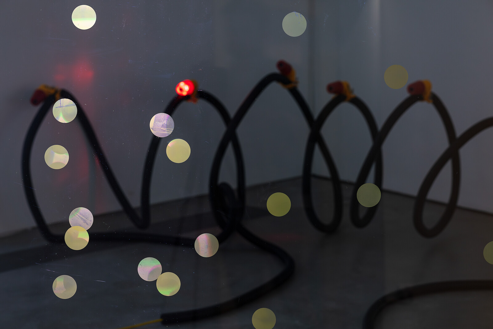 Echoing the helicopter’s winding trajectory, a yellow cable snakes between crates and over stands. It is wrapped in the corner with a segment of black tubing that rises off the ground in a series of loops, each topped with a red light, one flashing. Then the wire disappears into a pile of rubble next door where a map of Abuja drawn in the dirt reveals a buried lightbox. Facing the luminous diagram is a wall of ventilation fans—steel boxes with round holes— whirring away and circulating the smell of damp earth.