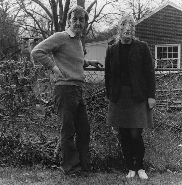 The monstrously distorting masks worn by many of Meatyard’s subjects are even more grotesque when mismatched with the gender and age of their bearers (e.g. Romance (N.) from Ambrose Bierce # 3, 1962). While flirting with partial anonymity, telltale signs of body and dress still say something about their bearers. Extended re-contextualizations of the figure of his wife—both through her hidden, distorted face, and by placing her as one half of a series of other couples in mundane tableaux—suggest the simultaneity of attraction and repulsion; the unknowability of others; and an underlying, dark spirituality to ordinary lives. Yet something more evanescent hovers beyond these already ambiguous interpretations of those signs of reveal and conceal which are seemingly at cross-purposes in Meatyard’s photographs.