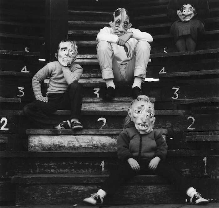 His decision to cover his models’ faces denies not only individuality but intimacy. These are not the enticing and disinhibiting masks of Rio Carnival but darkly libidinal occlusions and projections, shot through with hints of interpersonal failure. Their startling uncanny suggests a crepuscular American Gothic mythology akin to horror movies, or—given the all-white subjects and basic, Midwestern Americana settings—the Ku Klux Klan. The artist also wrought other “masks” through composition and technique: blurring subjects’ faces with shadow, movement, intervening objects, and bodies inclined away from a fuller view, as with a boy’s face half-erased by the grillwork in front of a mausoleum in Untitled (1955).