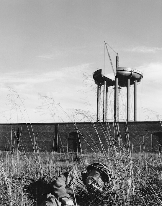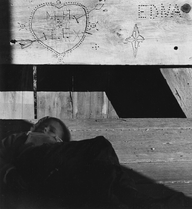 The black-and-white tones in Meatyard’s photographs hold forth something immanent that is not quite real, lived life. The choreography for his images—almost all of which deny clear viewing, by one means or another—play on the voyeuristic aspect of photography. The obscured and recumbent human figure is one recurring posture that Meatyard set up and captured, often with the suggestion of other figures above or nearby (at the very least, the implied viewer/photographer). This is the case with the buckskin-dressed boy half-sprawled in tall weeds below a hulking water tower in Untitled (ca. 1955); in Untitled (1960), sunlit graffiti carved on a slab of wood confronts the viewer as if from the fever dream of the boy over whom it hangs, immediately above the dark shade in which his just visible head recedes.