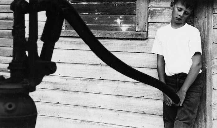 The question remains: if Meatyard was a mystic, what was his vision? How to read humans’ relations to their internal and external worlds in the off-white mass representing the torso of a boy seen from behind in Untitled (1961), his bowed head hidden from view, set in a field parallel with the beached gunnels and hulking trapezoid of a rowboat stuck in overgrown foliage on land? And what is the nature of reality suggested when he frames a huge water pump handle as if emerging from the crotch of a pubescent boy in Prescience (1960)?