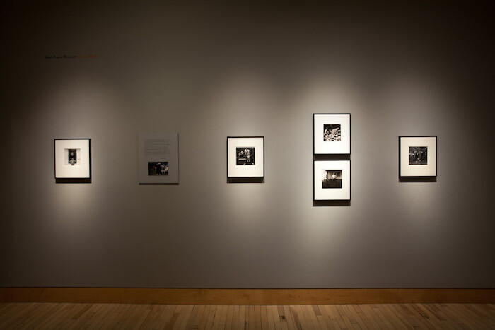There is frequently something awkwardly and even perversely erotic in the figures depicted by Meatyard. So many young bodies: children splayed on rocks; adolescents half-hidden from view by foliage, shadow, and elements of architecture. Even with his adult models, a coy sort of peek-a-boo occurs: the bared legs and clothed curves of his wife’s body under skirts and sweaters, her face hidden by a strange, encompassing mask, as in 15 photos from Meatyard’s fictional sequence “The Family Album of Lucybelle Crater” (1970-72). Along with the use of physical masking, this longer “photographic poem” further shifts the identities of individuals—known to the photographer and his wife in real life—through occasional hand-scrawled captions on the prints themselves.