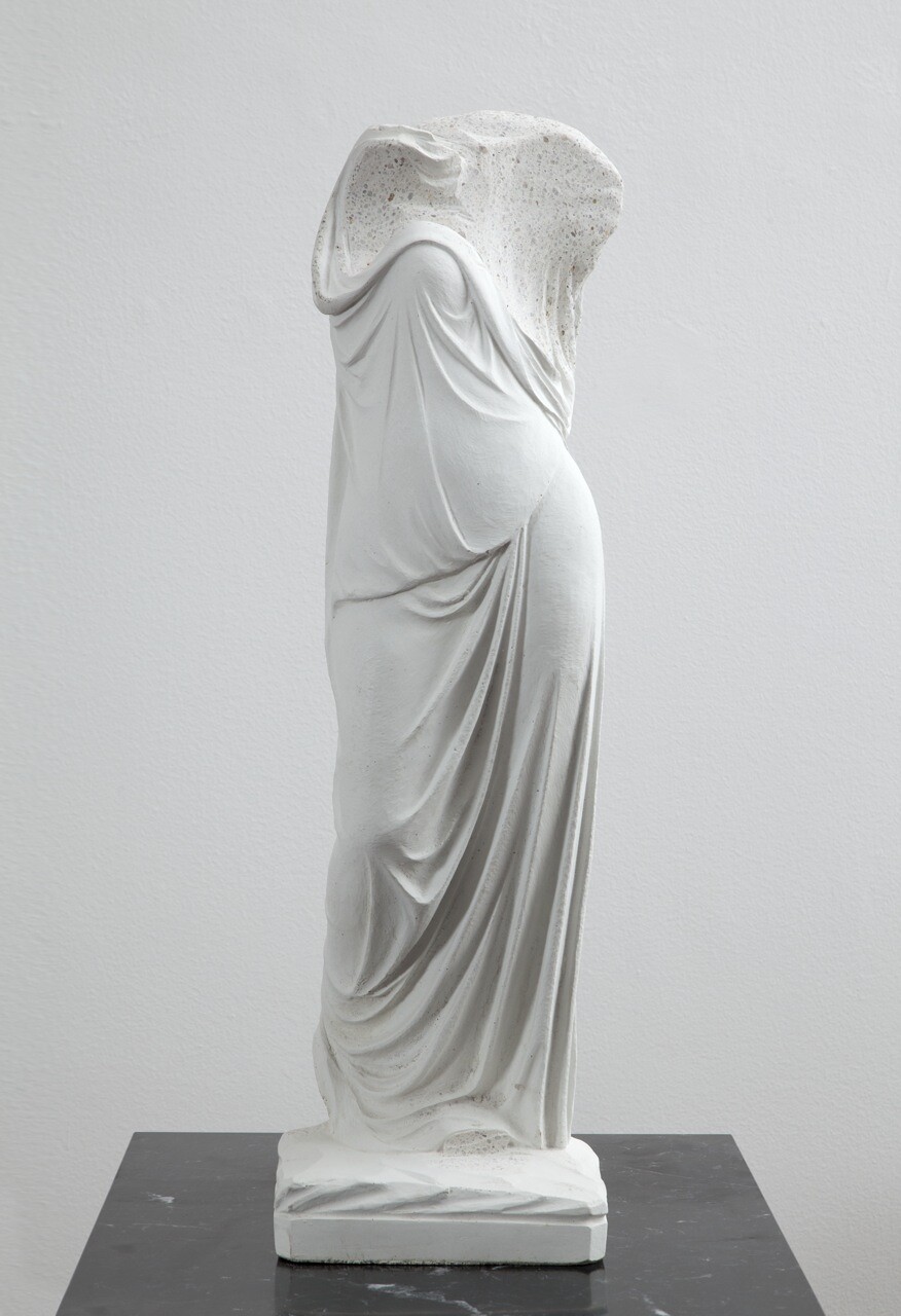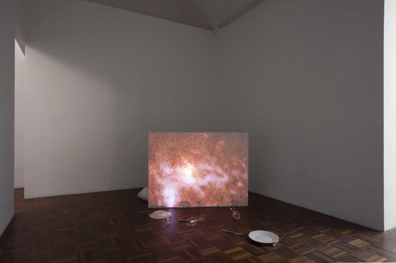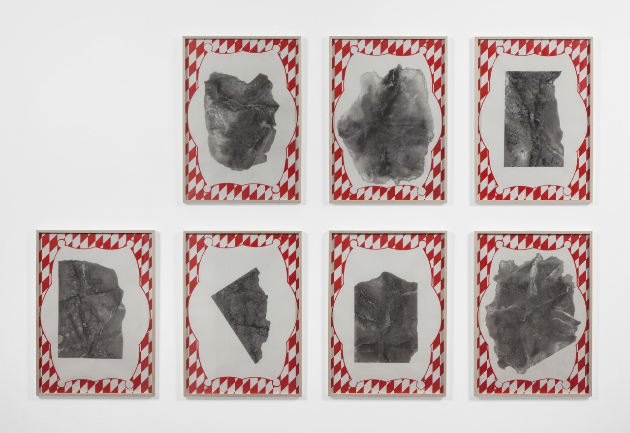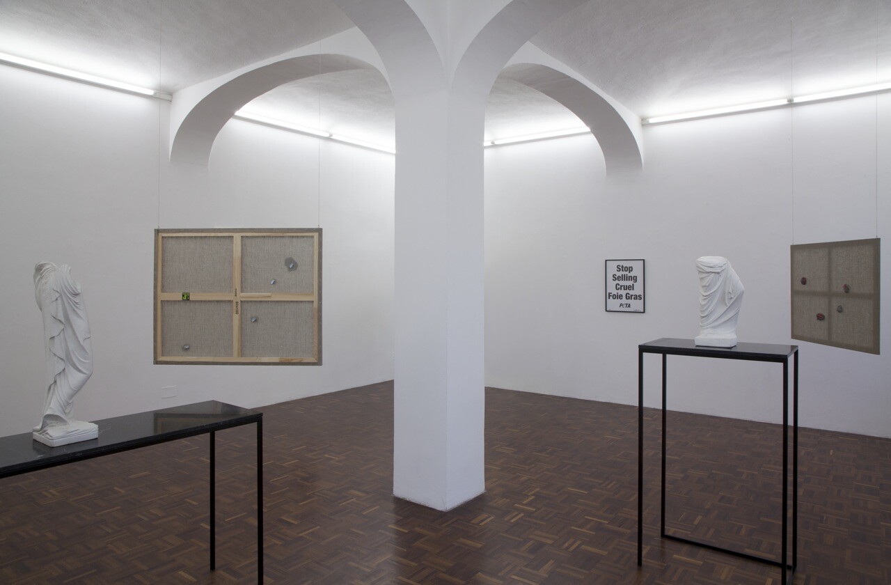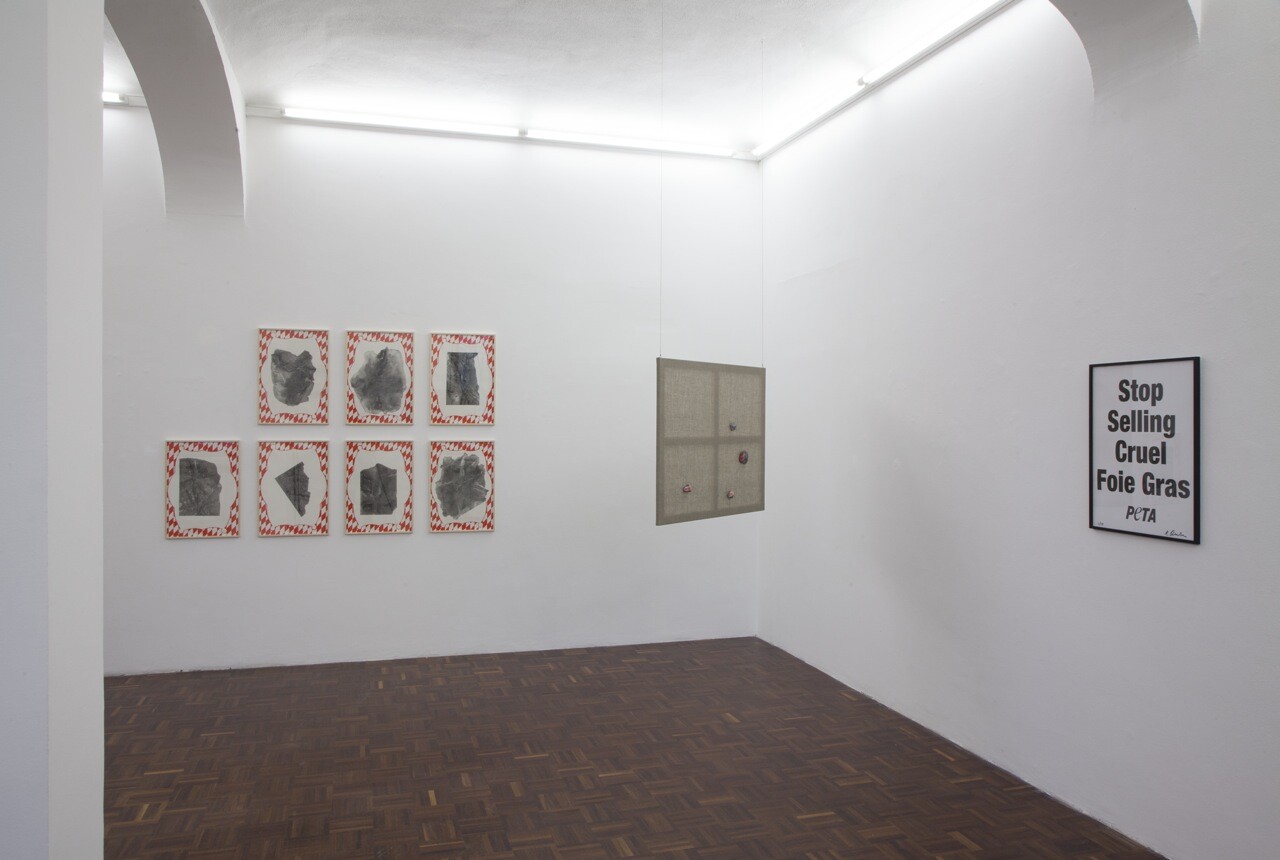 Danke’s exhibition at Norma Mangione Gallery in Turin takes this ambiguity one step further. The same room with the three canvases (Adopt. Spay. Neuter., Don’t make me a fashion victim, and Whose skin are you in, all works 2015) houses two small white sculptures on plinths. The stereotypically classical outline—fragments of human bodies represented in the manner of Greek statues—betrays their origin as serially produced garden statues, but all of the subject’s exposed body parts have been carved away. The empty concavities left within the folds of the drapery reveal the material’s surprisingly sensual granular texture. Instead of a horrific amputation, the result affords the polished beauty of Tony Cragg’s sculpture. Similarly, one of the room’s walls is lined with seven charcoal frottages of a marble floor (“Untitled”). The stone’s veins and layers are clearly recognizable in the subtle interplay of shades and streaks, but the drawings’ support—a thick sheet decorated with a blood-red-and-white checkered motif that Southern Europeans will immediately recognize as butcher’s wrapping paper—encourages a completely different reading of the work, the charcoal suggesting a black-and-white depiction of a steak. The same effect is achieved by a video, Mohrenstrasse (2015), projected onto the marble surface of a tilted table in a second, smaller room.