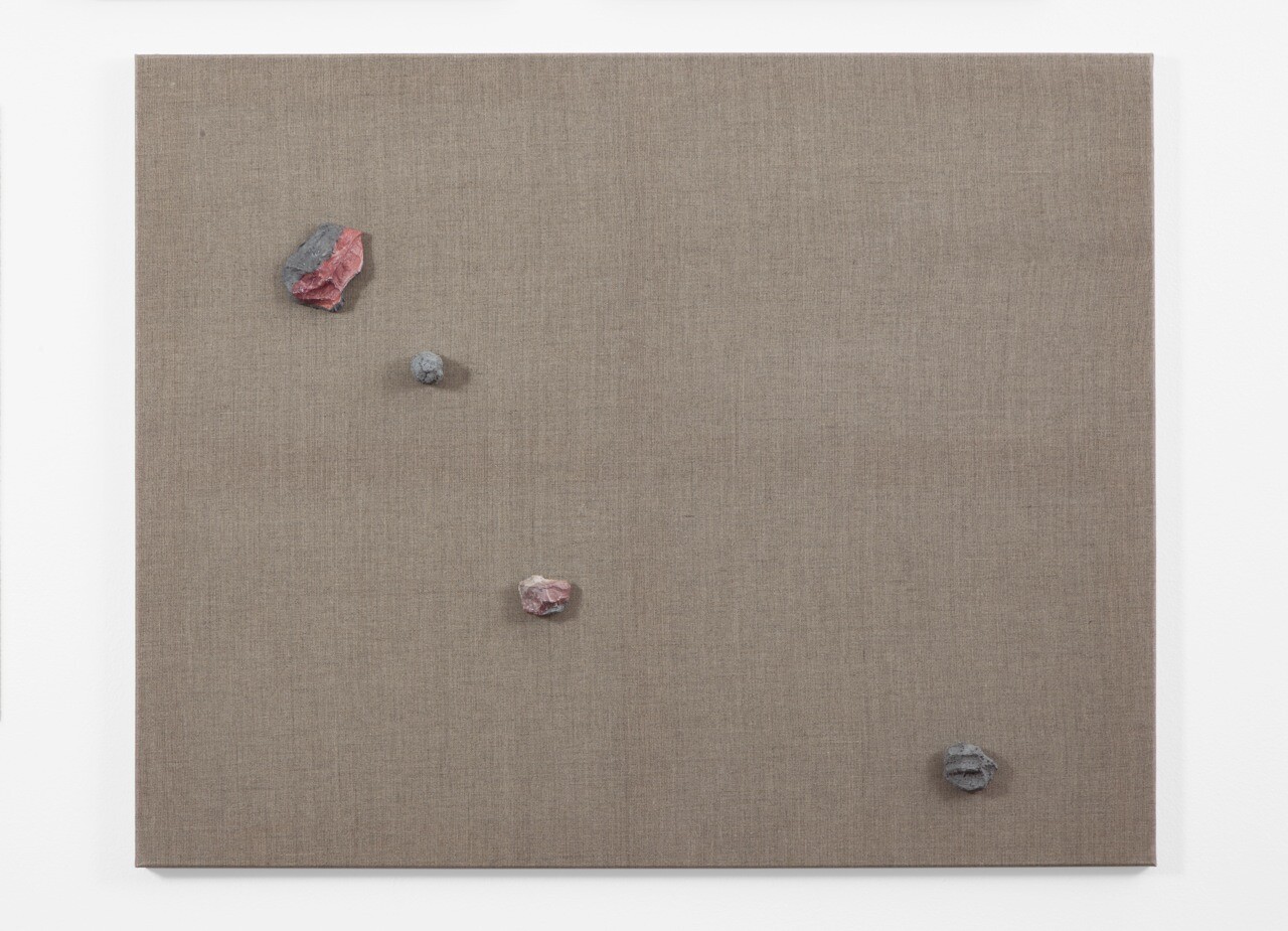 The most striking works in Raphael Danke’s “Stoneflesh Aura” are arrangements of small objects nailed to three unprepared canvases. They catch your eye, then transform two times as you observe them. At first glance, they seem to be shards of pink-red quartz only partially revealed from within the rock that encases them, the kind found in souvenir shops everywhere. As you are drawn nearer by the crystals’ shiny surface, you realize that the rock is in fact a smudged mass of solidified concrete, and the red glow actually comes from bits of glossy paper pasted over it. There’s something funny in the sudden contrast, something of a childish prank—yet before your laugh dies out you realize that what you took to be quartz, then colored paper, is nothing but cut-out pictures of raw red meat, and this is revolting. This mix of sensory fascination, visual irony, and disgust is a signature component in Danke’s work. It most notably characterized his best-known early work, “Entfernungen” [removals], an ongoing series of collages in which Danke reassembled cut-up pictures from fashion magazines in which every trace of human bodies had been removed. The resulting images were both appealing in a fashion spread-like glossy, slick way, and eerie in their subtle hinting at the absent human form.