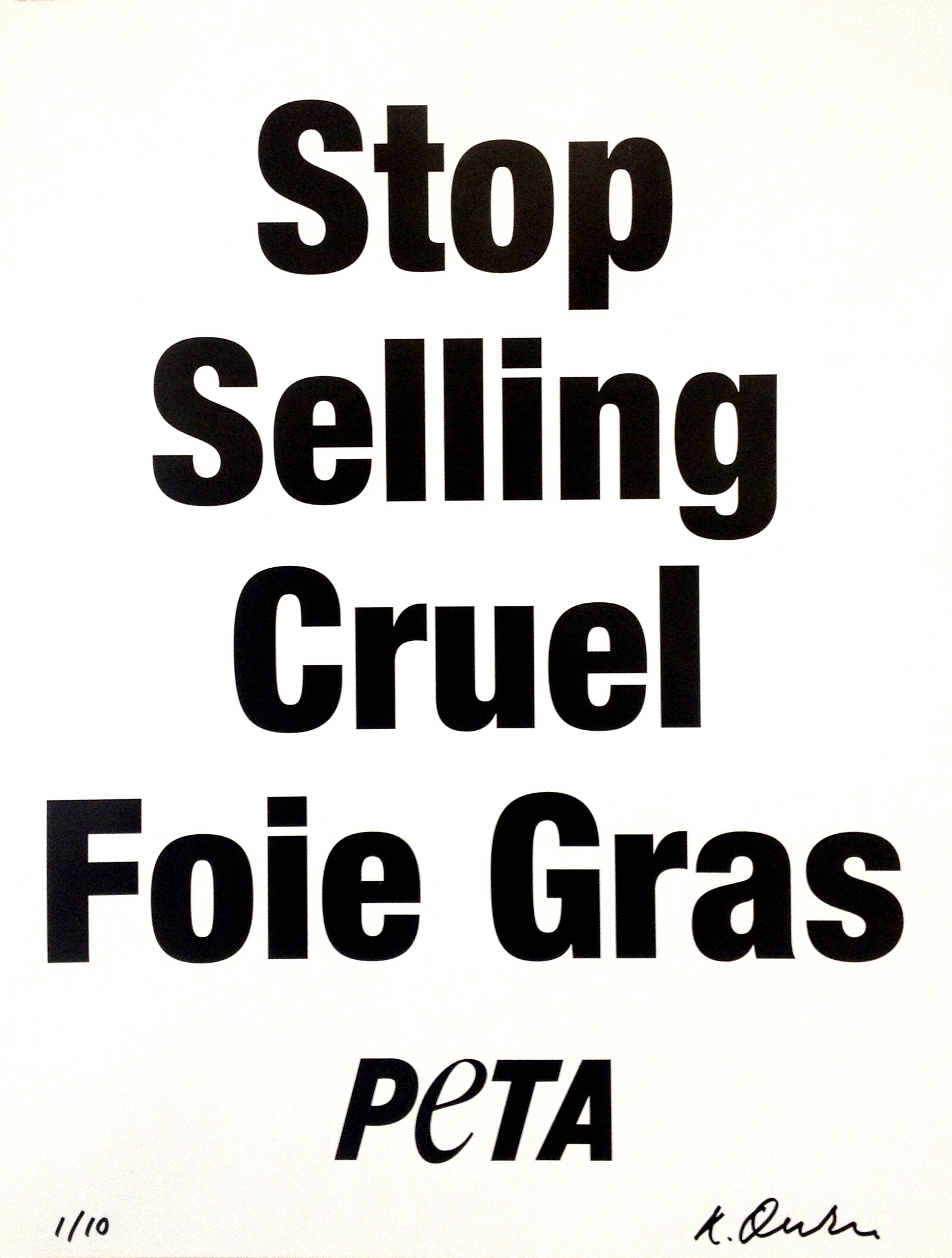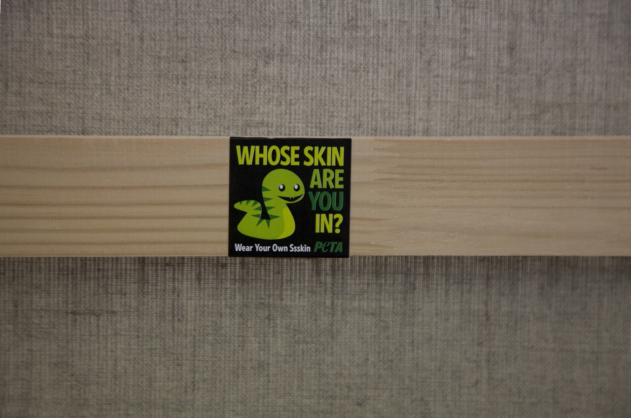 That opposition has a subtly political dimension as well. In Danke’s cut-ups, the bodies that disappeared were mostly female ones; this gesture underlined their inessentiality to the shiny signifiers of fashion, quietly evoking the discomfort of their absence. In a similar way, “Stoneflesh Aura” is lined with allusions to animals: beings made of flesh which we routinely re-categorize as objects in order to suit our needs. The canvases with the tiny stones have PETA stickers on their back frames; a poster with an animal rights slogan titled Stop selling cruel foie gras hangs in front of the drawings made on butcher paper. By tricking us into mistaking meat for stone, only to make us feel a vague sense of revulsion at realizing our mistake, Danke might be suggesting this revulsion should be felt every time we buy sausages or ham in a store. It looks like an object, but it isn’t.