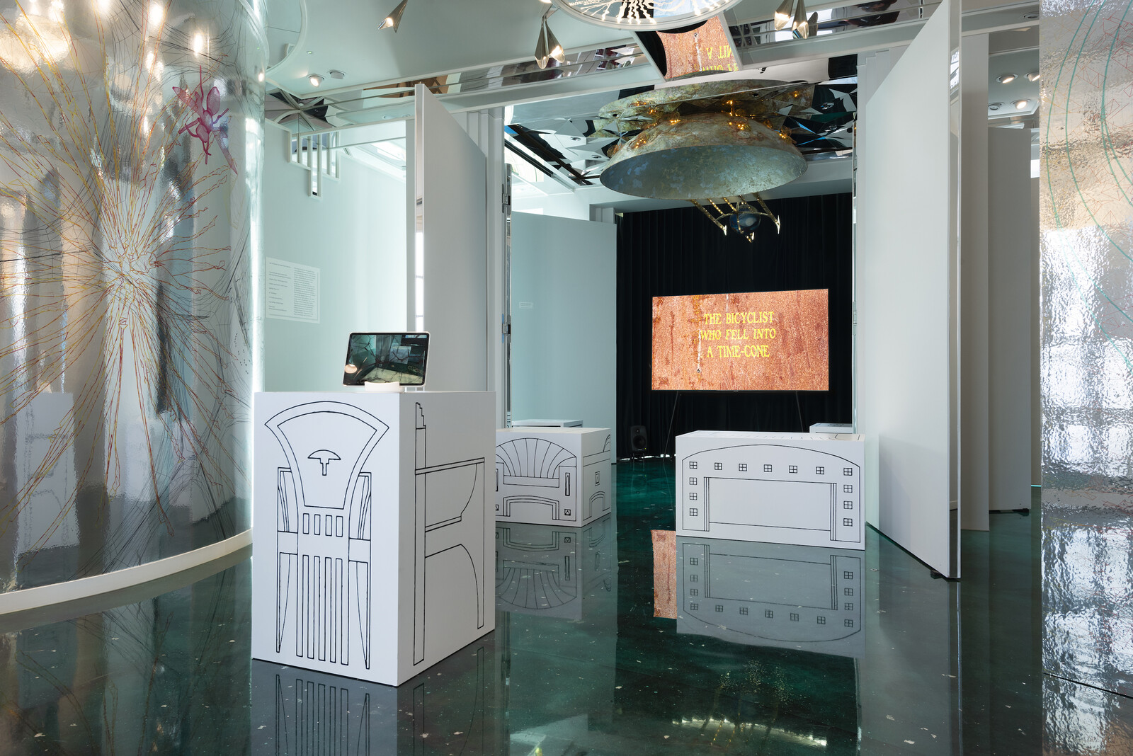 Raqs’s exhibition is in part an act of revision, offering a parallax view to Jencks’s large-hearted, yet western-oriented, postmodern practice some four decades after the fact. (1980 marked the first Venice Architecture Biennale, titled “The Presence of the Past,” in which Jencks outlined his theories of postmodern architecture.) Framing the video are five large wall drawings—of mesh cages, flies, and bicycles—on reflective panels: components of a larger work scattered throughout the museum, titled Betaal Tareef: In Praise of Off-time (and its Entities). The sense of revision or interference is emphasized in the work’s second component, comprising three AR works visible via iPads dotted in various rooms. These translucent floating forms—one resembles a moebius strip, another a purple flower—sway above pieces of furniture, including Jencks’s former bed. Ambiguous and spectral, these “entities” seem to render visible the felt effects of past events (one possible meaning of “off-time”) on the building’s atmosphere.