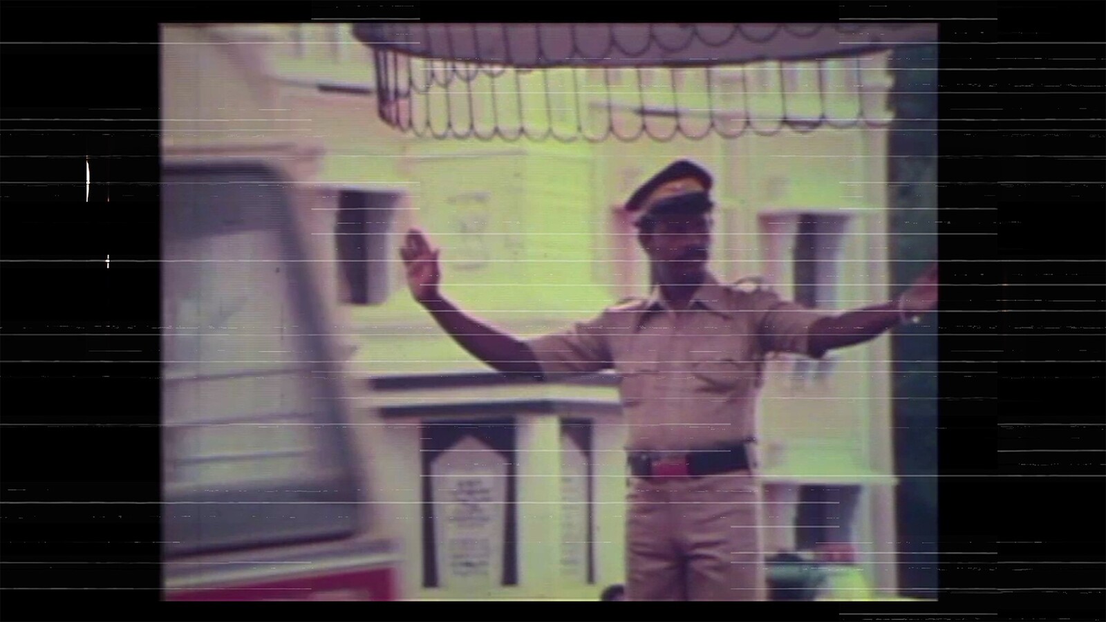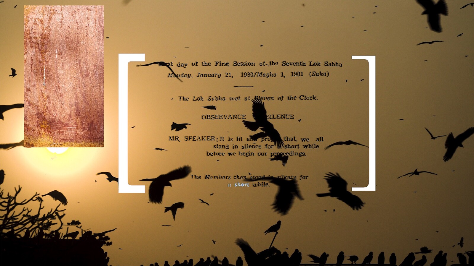 Playing on a flat screen at the room’s far end is The Bicyclist Who Fell into a Time Cone (all works 2023), a richly layered 25-minute video essay that forms the centerpiece of the show. The hypnotic central image is of a woman cycling in circles in various edgelands outside Delhi, the stark white dirt of which resembles lunar rock. Collages of found images—spacecraft, animals, fireworks, ephemera from the Delhi State archive, photos from Jencks’s trips to India—are animated across this new footage in a dynamic interplay of past and present. A meditative voiceover spoken by Narula dwells on historical events in the year 1980: a eugenics program to castrate bulls, a satellite launch, a plane crash. Meditations on fragile archives and fallible human recall combine to melancholic effect: “Memory without memory, that is our condition.” Yet to remind oneself that this is a causal universe is to imagine that a transcendent record may, in theory, exist: “Things might vanish from history, but they do not vanish from time.”