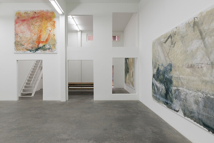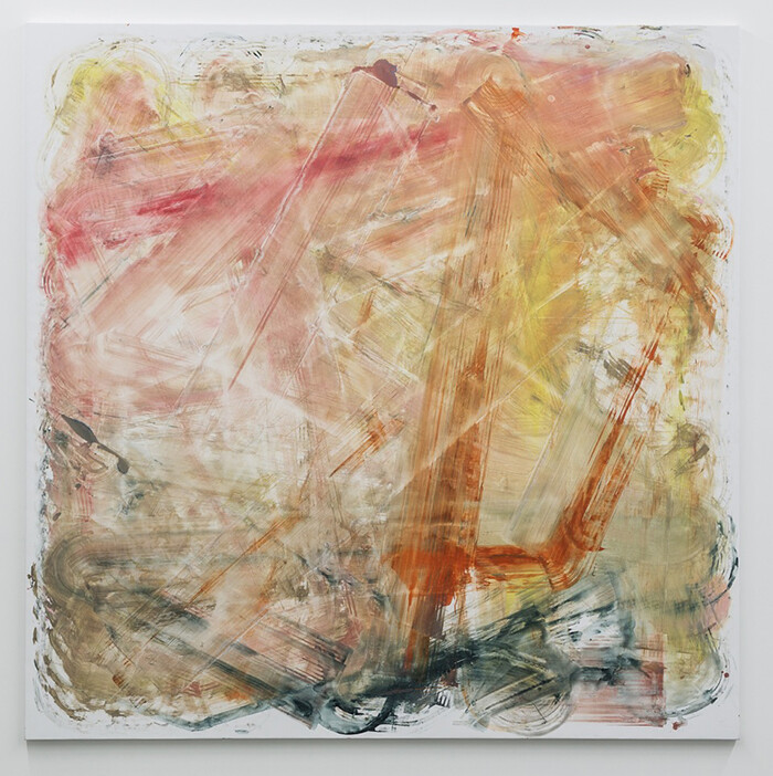 The show is not Reena Spaulings’s first exhibition of paintings produced in this way. Last year, she showed works of the same title at Campoli Presti in London. Another forerunner is a series of works Spaulings produced in 2011 using Yves Klein’s technique of the anthropométrie, which for Klein typically involved using naked female models as “living brushes.” Reena Spaulings used art historian Michael Sanchez as a human brush in what subsequently became the “Michael paintings.”