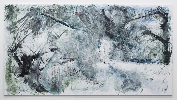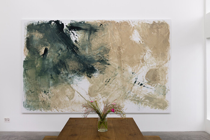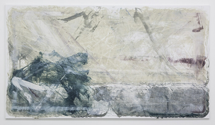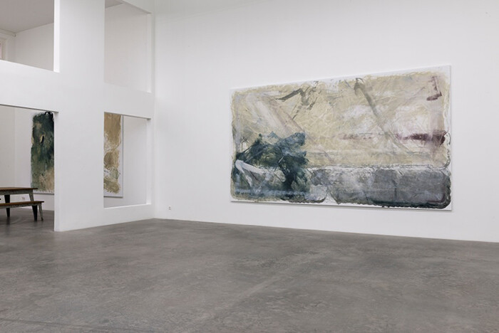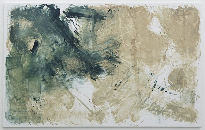 In her most recent exhibition at Galerie Neu, the fictional artist Reena Spaulings (a collective of artists including, in this exhibition, John Kelsey, Jutta Koether, and Emily Sundbladt) shows four large-format paintings. All of the canvasses were colored by a floor-scrubbing robot called Scooba 450 and using high-end decorative wall paint colors with names like “Mouse’s Back” or “Smoked Trout.” One of the paintings is titled Bohemian Groove (all works 2015), a pun on the famous Californian all-male VIP resort Bohemian Grove. The other three all are titled Later Seascape, a reference to works of William Turner, the nineteenth-century English painter whose works became almost abstract in his later period. All the paintings on display in the gallery—and even some more of the same series, not exhibited here—were produced during the week leading up to the opening.