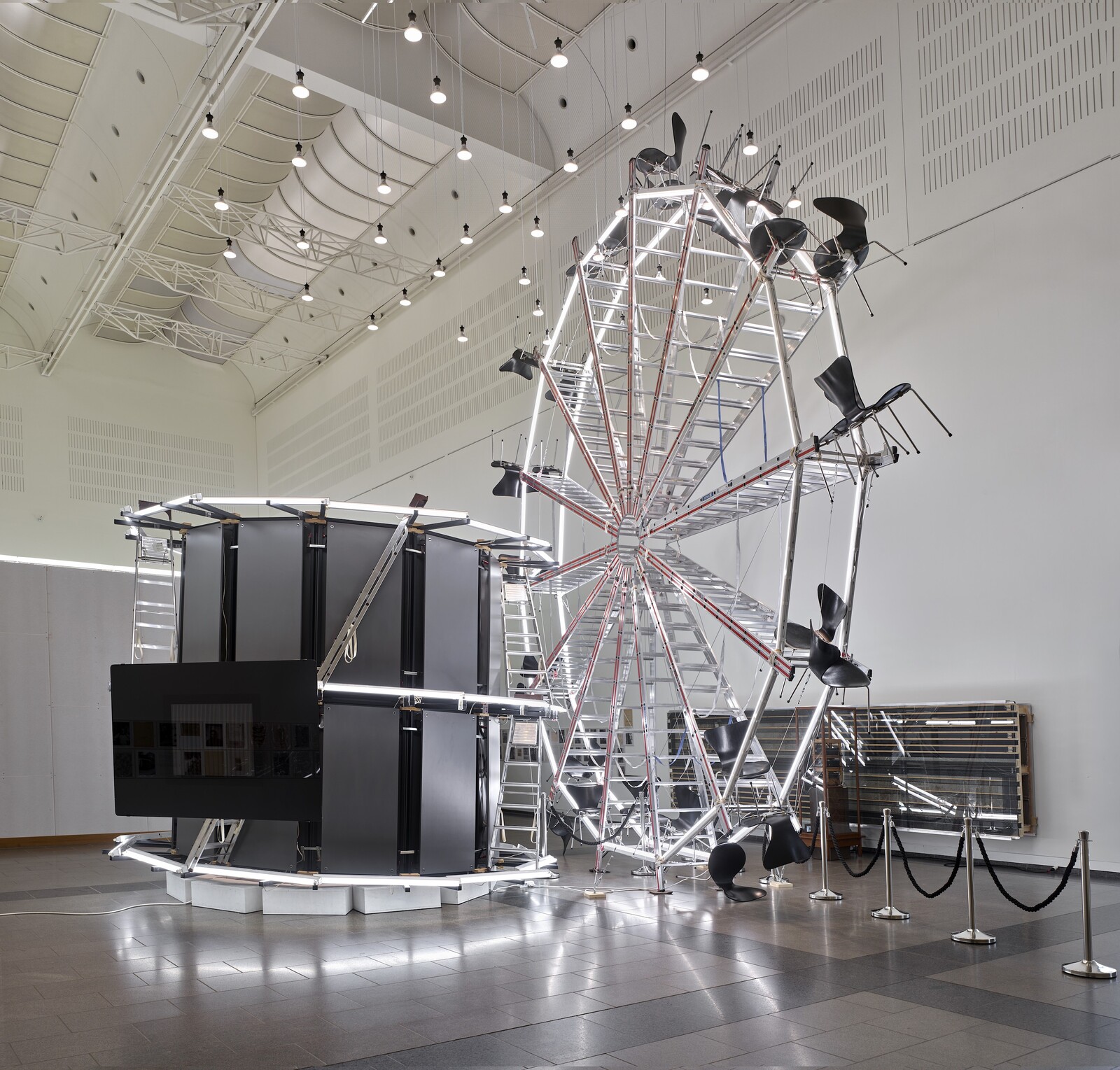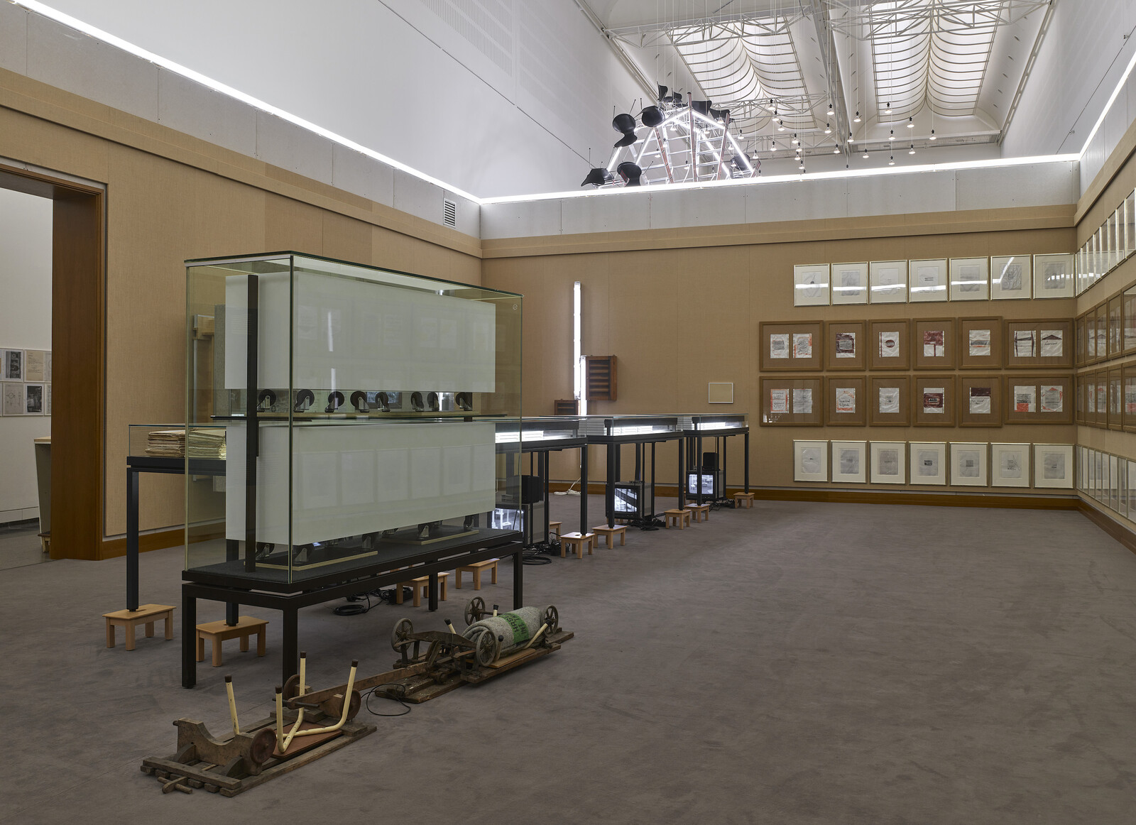 A single large hall on the ground floor of K20 brings together several significant installations, the centerpiece of which is Das Figur-Grund Problem in der Architektur des Barock (für dich allein bleibt nur das Grab) [The Figure-Ground Problem in Baroque Architecture (for you alone is only the grave)] (1985/2022). This virtuosic construction conjures a Ferris wheel and “wall of death” from shiny aluminum ladders, office chairs and tables, trussed together with tape and zip ties, held taut with metal cables, and lit with fluorescent strips. It is astounding that this baroque vision actually holds together, given its apparently provisional nature and the self-evidence of its constituent elements. Both playful and precise, it is a carnival of bureaucracy that keeps the whole and its parts in exquisite equilibrium.