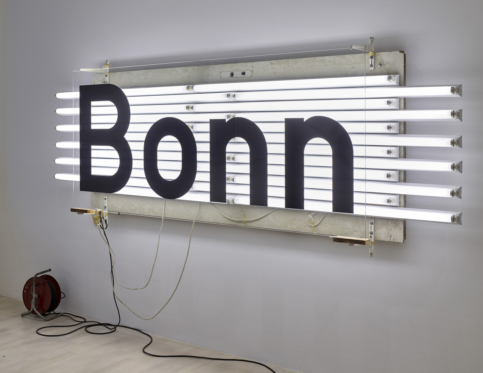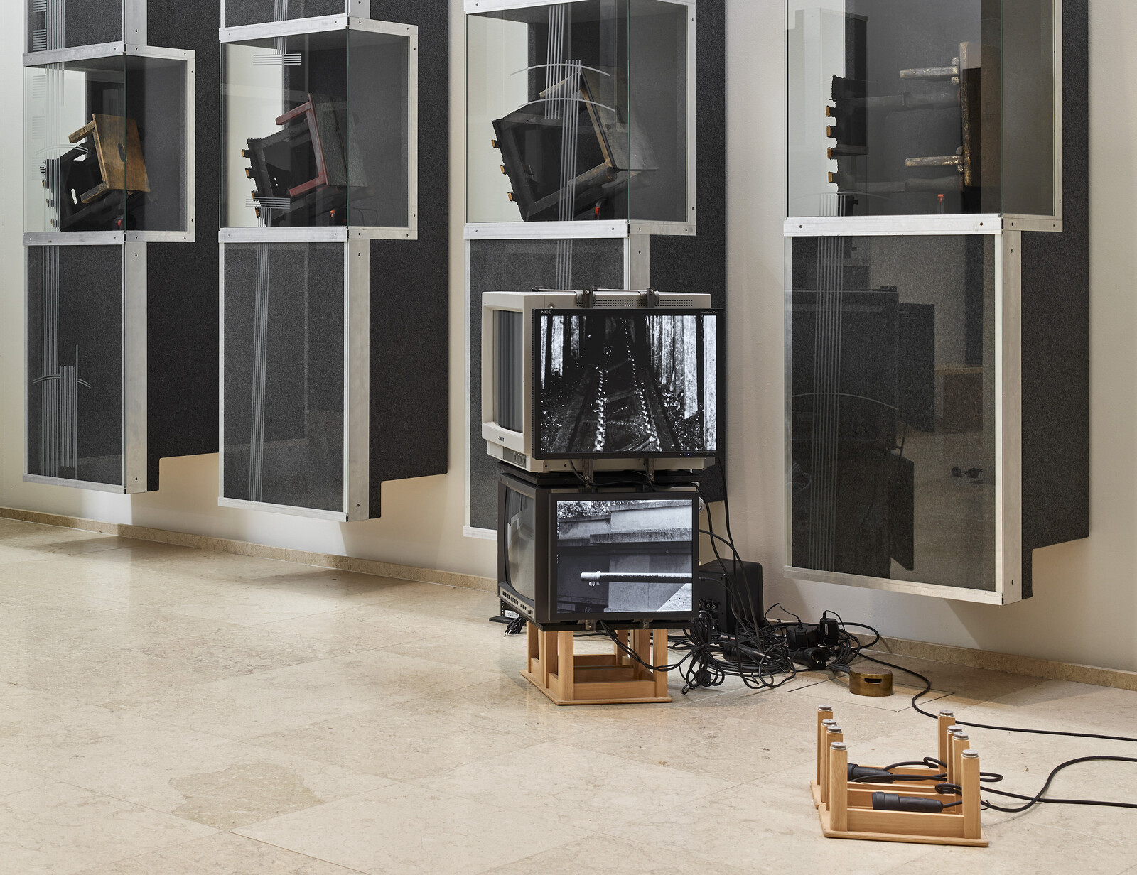 Mucha studied at the Düsseldorf Art Academy in the 1970s and since the early 1980s has had a studio in a 1908 former railway administration building. The artist’s claims on this city were given an official stamp in 2002 when K21 opened in the former state parliamentary building, and Das Deutschlandgerät [The Germany Device] (1990/2002/2021), an enormous work by Mucha, was given pride of place. (In recent years its permanence has been a source of local controversy.) Originally made for the German Pavilion of the 44th Venice Biennial, this forms the center of the retrospective’s second venue, which unfolds through thirteen surrounding rooms. A cell clad in travertine, it is lined with Mucha’s signature wall-objects: precisely construed arrangements of aluminum profiles with felt linings in which the floorboards from his studio are preserved behind reflective sheets of glass. A second sequence of glassed-in wall-objects in the exterior space each houses a small wooden footstool (another signature Mucha element.) A rumbling soundtrack of cars passing over a bridge describes the relentlessness of the post-industrial everyday.
