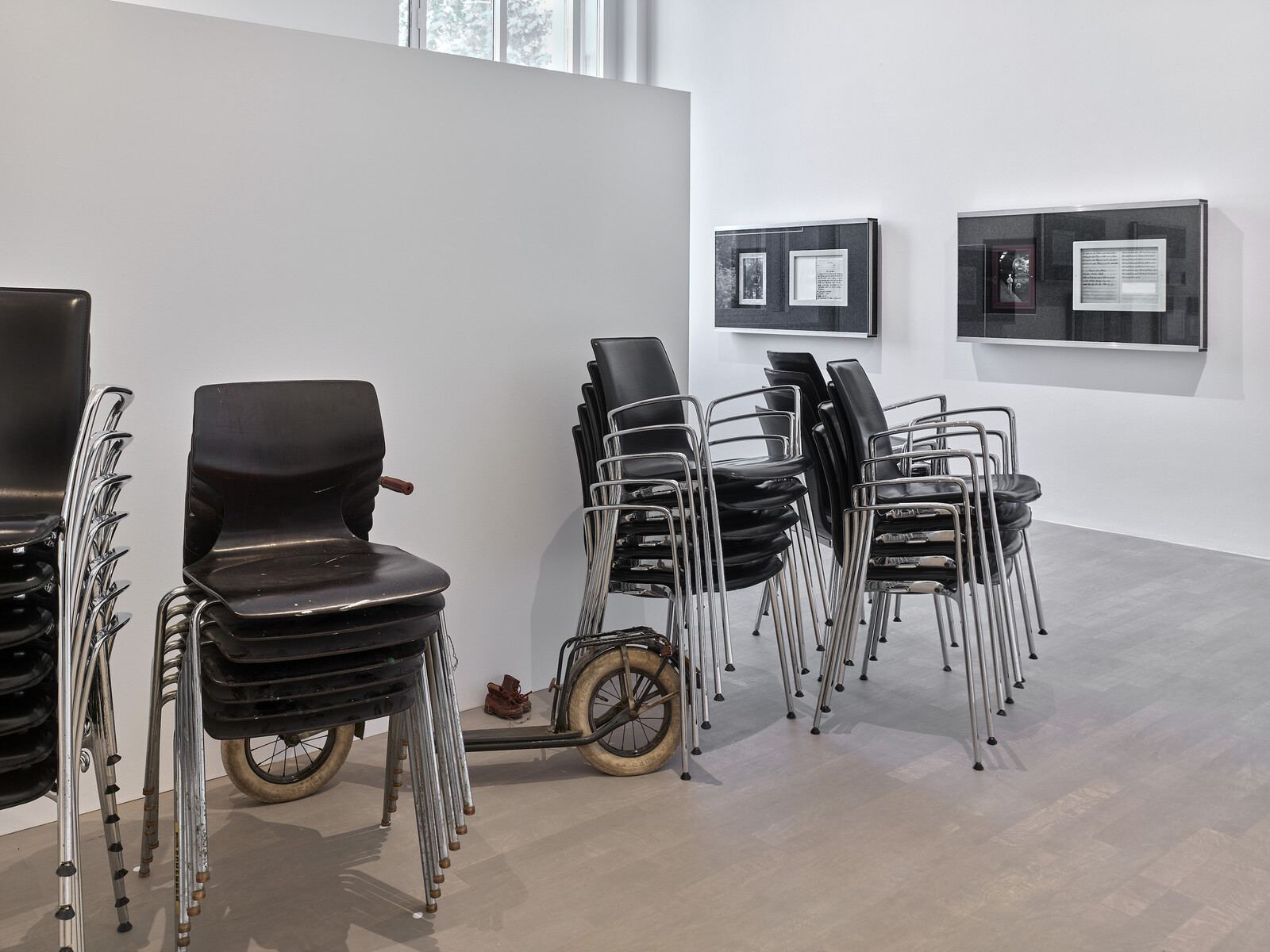 Elsewhere black and white photographs, personal documents and object relics from Mucha’s past interject tenderness, irony, or humor into administrative functions. In Schnee von gestern – Auszüge aus dem großen Kalender III [Snows of Yesteryear – Excerpts from the Big Calendar III ] in K20, accumulated evidence in A4 format, filed in plastic sleeves, framed and hung on the wall in two rows, are like a Bildungsroman plotting out Mucha’s journey to becoming an artist. There are official documents from military service and an internship in a hospital, notes and diagrams from his apprenticeship as a blacksmith, interspersed self-portraits, and neatly labeled plant specimens. It asks what is it like to be a student, a worker, an artist—a man—born in West Germany in 1950. One sentence appears repeatedly like a mantra across the material: “Nur einer darf krankschreiben. Der Arzt.” Only one person can write a sick note. The Doctor. Who is the doctor that forms a diagnosis? And who is the patient here? An individual? A whole society?