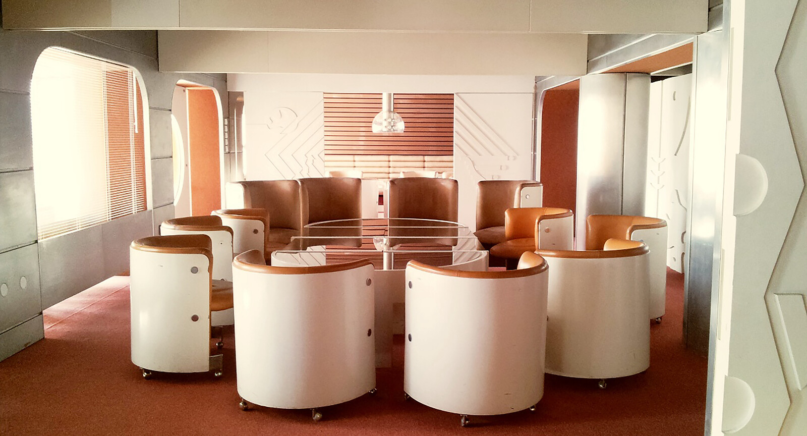 To turn left upon entering the darkened exhibition hall of “Retrotopia: Design for Socialist Spaces” is to encounter a motley, utterly heterogeneous collection of objects ranging from the decorative to the domestic to the medical. Nestled against one wall is Cosmic Fantasy (1965): an experimental public sculpture work by Lithuanian artist Algimantas Stoškus consisting of luminescent slabs of stained glass arranged, Tetris-like, on a series of suspended geometrical forms. Adjacent to this is a mint condition Saturnas vacuum cleaner—the ultimate kitschy fusion of lofty, celestial aspirations and household banality—complete with orbiting moon wheels and ring. In a vitrine just opposite the Saturnas is the least recognizable item of the group: a tubular, vaguely biomorphic form that appears to be woven out of some sort of textile. This, it turns out, is one of the first vascular prostheses ever made: a specific model of artificial aorta manufactured in 1960s Lithuania using re-engineered German ribbon-weaving machines. Selected by Lithuanian curator Karolina Jakaitė, this eclectic assemblage of objects and artworks (along with contributions from other Lithuanian creators like sculptor Teodoras Kazimieras Valaitis and architect Vytautas Edmundas Čekanauskas) is one of eleven unique “capsules” that comprise the collaboratively curated “Retrotopia.” In its simultaneous diversity and specificity, it exemplifies the sweeping, at times challenging exhibition, which attempts to convey both the breadth of the utopian imagination and the granular, material histories of the objects and spaces created in its name.