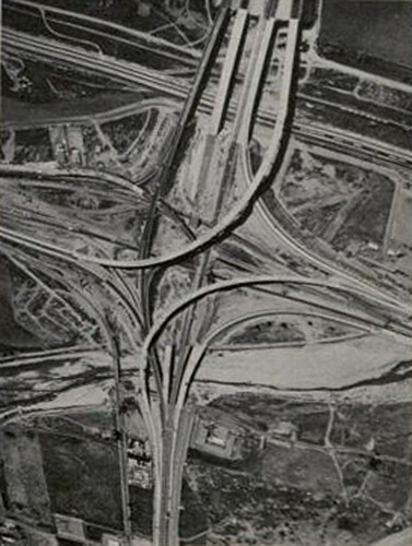 Insidious propaganda for freeways is everywhere, even in the head of an unsuspecting English scholar naively supposing the proposed Century Freeway could be a beneficial, cooperative venture between the division of highways and the “community of Watts,” in which “new houses and apartments, emphasizing neighborhoods, would be built for the people dislodged by the freeway” (John B. Rae, The Road and the Car in American Life, Cambridge, Massachusetts, 1971, p. 312). (Where? In the rest of crowded Watts where five units on a single-unit lot is common? Or under the new freeway like the store Highway Patrol cars?)
