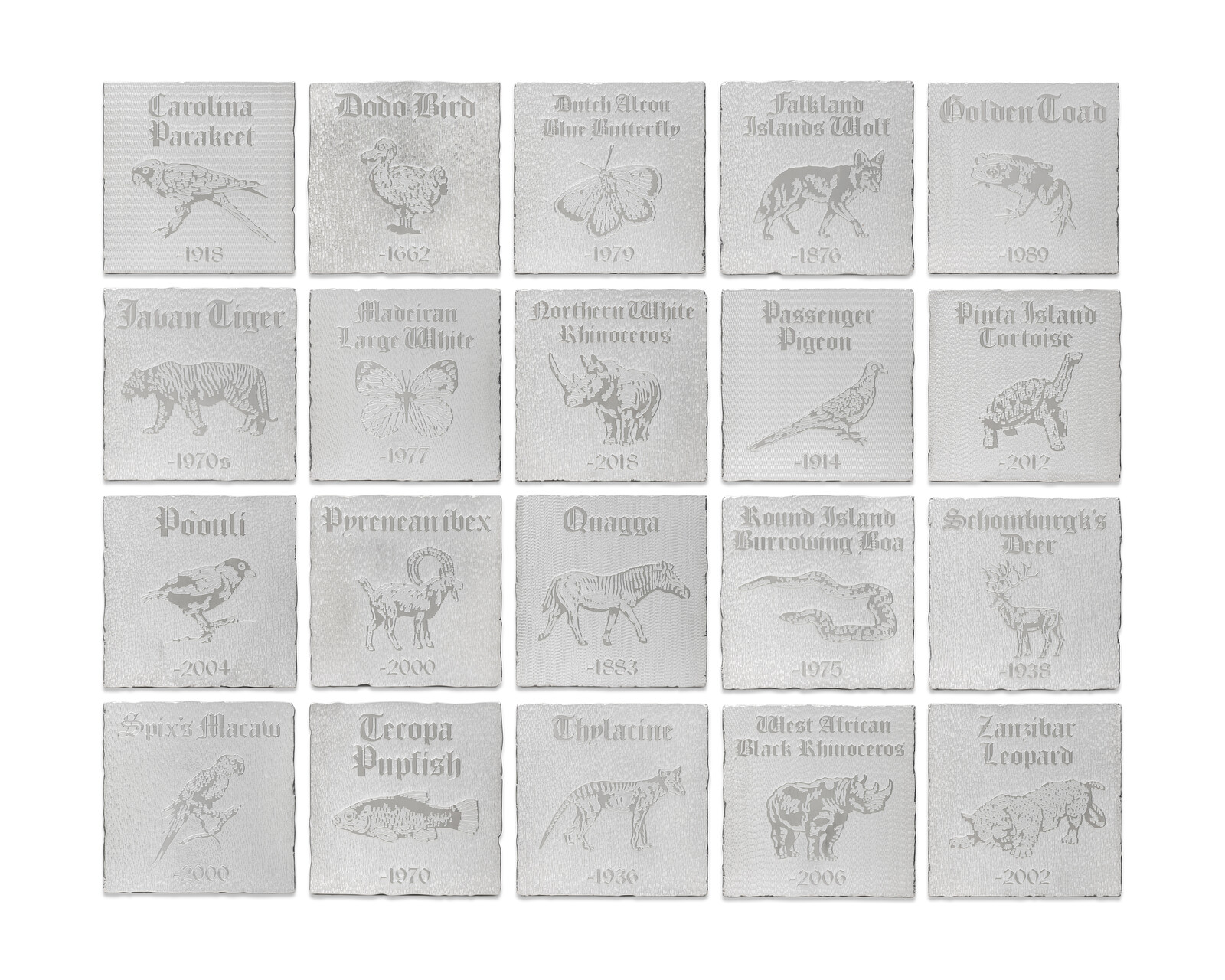 In an adjoining room, death is confronted directly and invisibility becomes a means by which to start the process of mourning. Silver plaques scattered across the gallery floor memorialize extinct species including the Quagga (declared extinct in 1883), Schomburgk’s Deer (1938), Spix’s Macaw (2000), the Zanzibar Leopard (2002), and the Pinta Island Tortoise (2012). Tiravanija’s installation untitled 2020 (nature morte) (2023) invites the visitor to crouch down and, through frottage, trace and recreate the images of the animals on these “tombstones” over and over again. The purpose seems to be to remind the viewer that their world cannot be separated from that which was once inhabited by these species, and to insist that they are shown the commensurate respect. I shuddered a little imagining the shades of these departed animals.