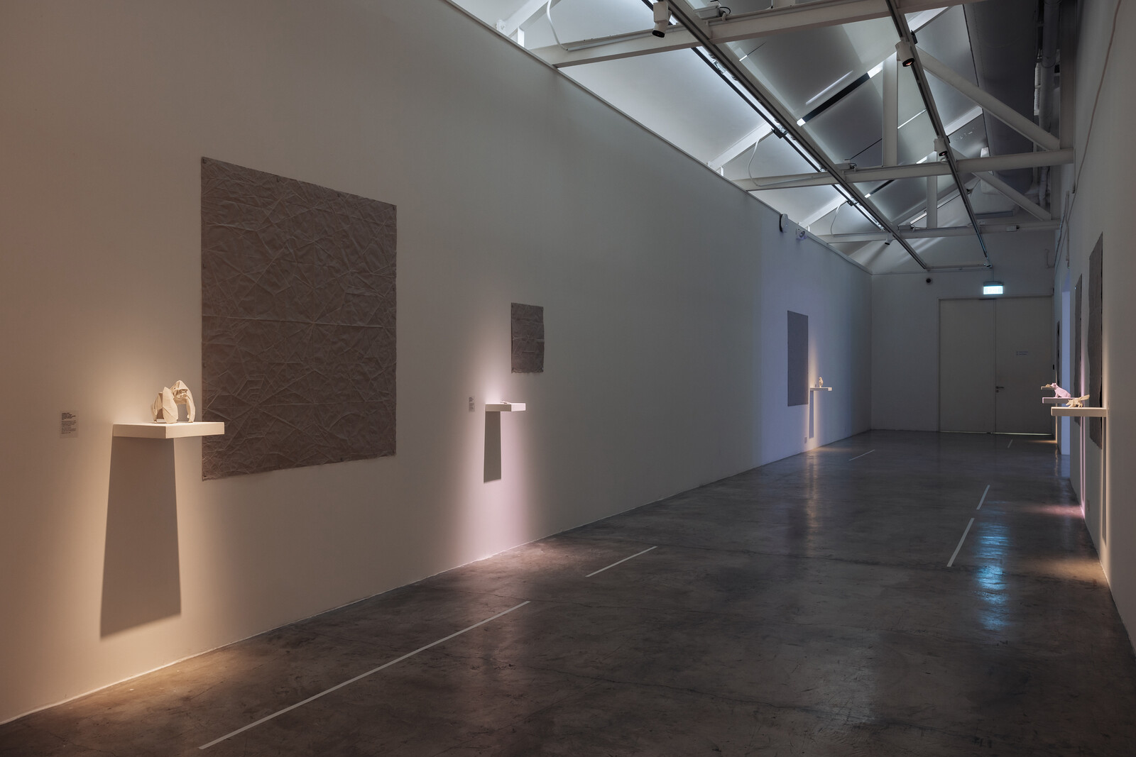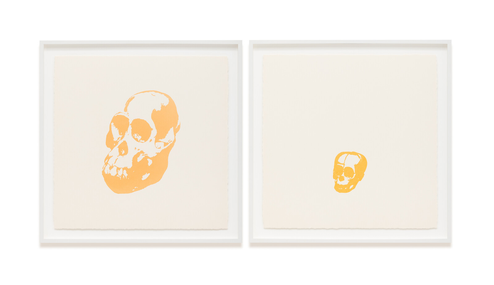 Down another dark hallway are seven spotlighted origami sculptures of animals, each displayed beside a large, mounted, unfolded sheet of origami paper marked with countless creases. Thus each sculpture is accompanied by a version of itself which has been unfolded or unmade. In Untitled 2020 (extinction series: tapanuli orangutan pongo tapanuliensis) (2023), for example, Tiravanija displays an origami sculpture of an orangutan beside an unfolded sheet on which is printed another “invisible” image that only shows up under UV light. The diptych print Untitled 2020 (we don’t recognize what we don’t see) (2023) presents images of the skulls of a female orangutan and her child. As with the tombstone series, these memento mori might also serve to remind visitors of the looming extinction of their own species: another tragedy that we choose not to see.
