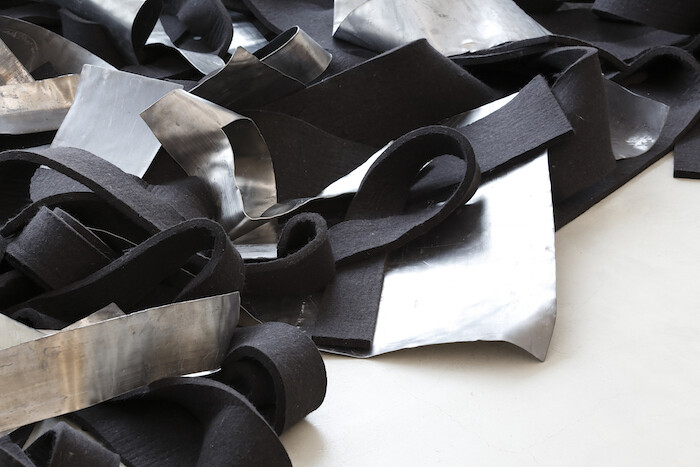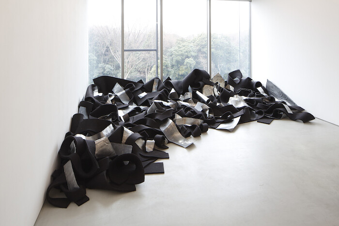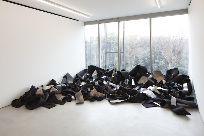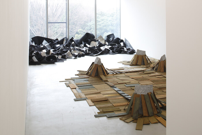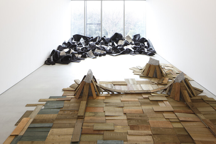 At Blum and Poe’s fifth-floor gallery the two works face each other from opposite ends of the same room. Lead and Felt is pushed up against the window overlooking the nearby park and train station; the five blocks of granite stone that establish Parameters of Space map out a more methodical “field.” Surrounded by wooden tiles which pave the floor, Suga’s piece is a counter to the spectacle of Morris’s work. With each “re-staging,” Suga creates situations that illustrate his own relationship with the space, formed from material that teeters on the edge of coming undone. Though ideas are prototyped at his Morioka studio, each reworked piece resists merely replicating previous incarnations by the way it is adapted each time, subject to what Morris refers to as a “continuous process.”