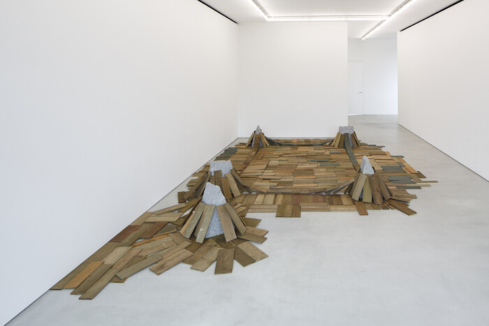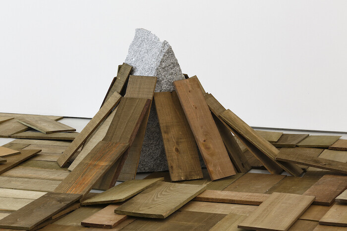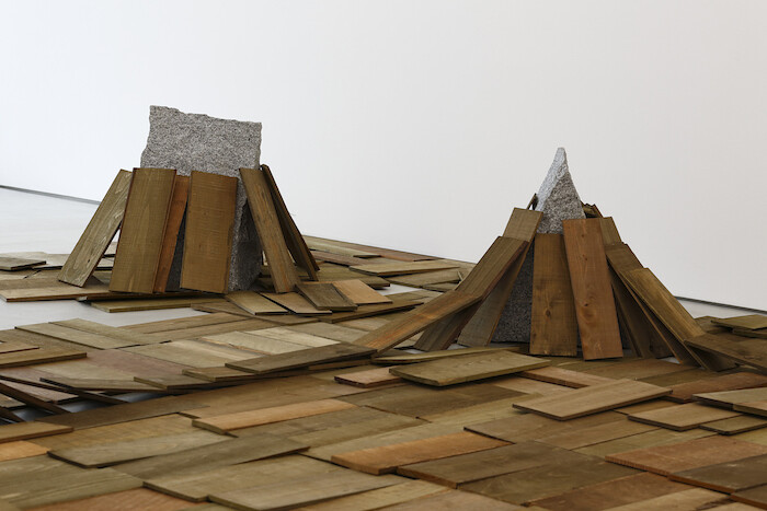 Parameters of Space was made for Kishio Suga’s 1978 solo exhibition at Gallery Saiensu, in Morioka. His interest in borders was laid out in rectangular pieces of wood organized around five granite wedges; the configuration changed with each exhibition, so that the piece formed different relationships with the venue. After each exhibition the work was also discarded—in this case deliberately—and then remade.
