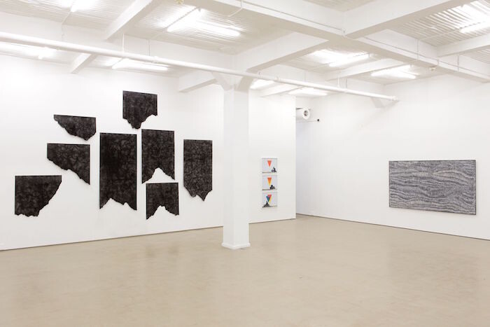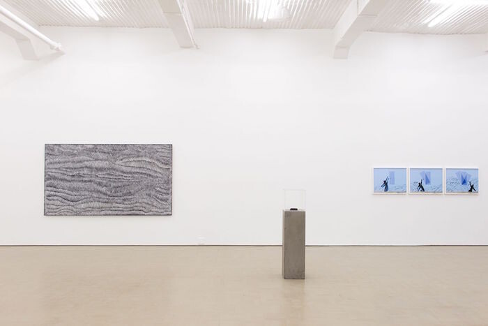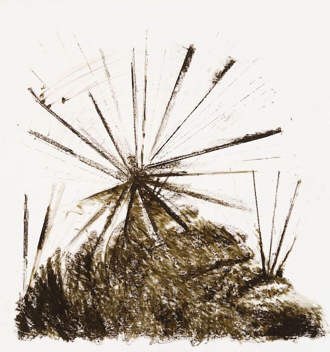 Rhode’s work has always embraced tonal restraint, perhaps due to his early use of charcoal on white walls. Untitled/Trees (negative) (2016), a nearly two-and-a-half meter abstract drawing made from chalk and acrylic crosshatchings, exemplifies the endurance of this low-key tonal register in his current work. The drawing is likened, in the press release, to Alighiero e Boetti’s ballpoint pen drawings from 1972. The comparison is tenuous, but explicable: “Paths and Fields” is loosely rationalized as an investigation into Rhode’s longstanding interest in the legacy of Arte Povera following a 2005 visit to Castello di Rivoli in Turin. “I have this romantic notion that my exhibitions pay homage to the roaring Seventies of Italian art,” Rhode is quoted. His interest in the spectral legacy of Arte Povera—and the genealogical mapping this involves—is worth parsing.