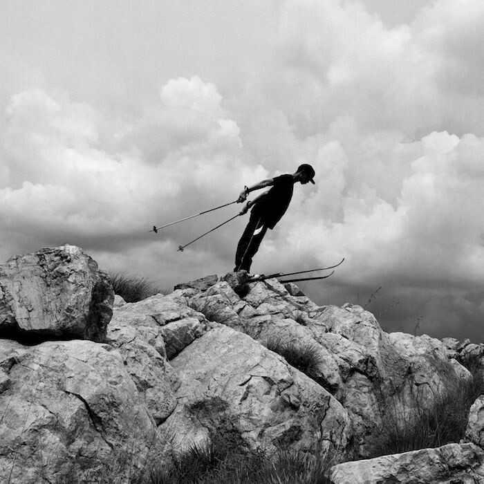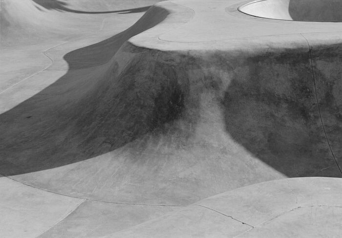 Producing works with propulsive energy from the barest means is one of Rhode’s gifts. LA Skatepark (2012-17) is a photographic description of an empty recreational environment, its curved surfaces abraded and marked through repeated use. The immanent scene, one in which observation rather than intervention is the artist’s only contribution, contrasts with the frustrated stillness of Slalom (2012-17), in which a young man, one of Rhode’s cap-wearing performance doppelgängers, is presented in snow equipment trying to ski on a rocky outcrop. Irony and frustration are coded into Rhode’s practice, which, early on, included live performances in which he interacted with wall-drawn objects. A precursor to his sequential photographs, these early performances sublimated his adolescent experiences of hazing at school into a viable practice.