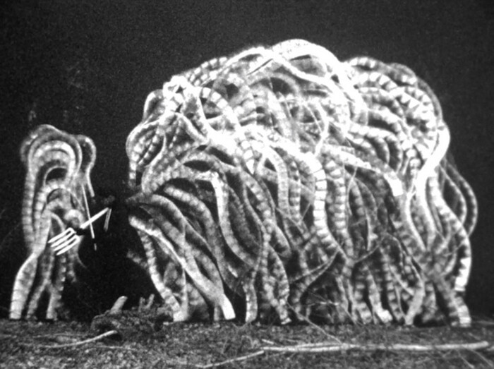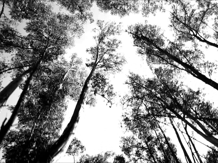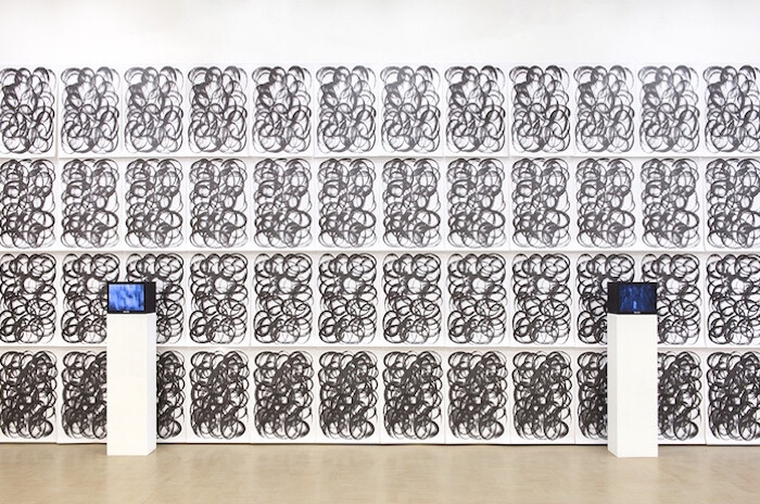 Rhode’s digital animation The Grass Is Singing (2015), which shares its title with Doris Lessing’s 1950 novel about racial politics in former Rhodesia, is a melancholy study in material lack and mimicry: his costumed doppelgänger plays a violin using an oversized fork and stick against a black wall that gradually fills with growing, rhythmic white lines. The violin solo, played by Martin Weiss, was scored by Berlin composer Arenor Anuku and forms a concise addition to a growing body of animation works produced in collaboration with Anuku. Trees/Earth/Paths and Fields (2016), an installation featuring two black-and-white videos replaying footage of the titular subjects, is grander in scale but less engaging. The installation includes a backdrop of posters with billowing motifs repurposed from Rhode’s ambitious if turgid staging of Arnold Schönberg’s one-act monodrama Erwartung on Times Square for Performa in 2015 (“Arnold Schönberg’s ‘Erwartung’: A Performance by Robin Rhode”).
