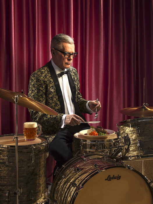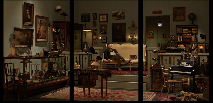 Antiquarian Sleeping in his Shop (2017) is a triptych five and a half meters wide featuring the shopkeeper at the center, raised as if on an altar, though snoozing on his sofa while reading cultural polymath Harry Smith’s interviews. Crowded around him, each object delicately placed, are hats, botanical models, paintings, lamps, occasional tables, frames, baskets, small totem poles, musical instruments, and a bookcase with titles ranging from Asger Jorn to Thomas De Quincy and Ian Fleming. References and echoes spill out, and span centuries and media, starting, let’s say, with the ecclesiastical composition and ending somewhere around a rabbit mask’s more recent parallels with Donnie Darko or Halloween. Graham is the consummate Renaissance man; he even made light of the idea of cultivated erudition and Renaissance music in a 2006 photograph of the same name. Other targets for his barbed wit include the figures of auteur, hermit, artist, and detective. Yet he still stitches together these immense self-portraits, which here include a jazz musician eating his dinner from a drum kit (Dinner Break (Salisbury Steak), 2017), a figure pulling on a long woollen coat in a darkened hallway (Coat Puller, 2017), and another nursing a beer alone in an artists’ bar (Artist in Artists’ Bar, 1950s, 2016). Positioning some figures, like the lecturer, in a historical context adds the potential of ping-ponging perspective: hindsight combined with nostalgia or disdain for the hopes of that time.