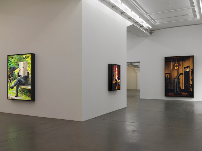 A lot more could be said here about re-enactment and disguise, but Graham is always in these images and self-portraiture is a familiar, yet nonetheless exceptional form. Selfies are all the rage, but artists employing self-portraiture tend to do it equivocally: think of Gillian Wearing’s masks or Cindy Sherman’s prostheses; Chantal Joffe is an outlier. It takes some nerve to look oneself in the eye and hold that gaze and Graham rarely does; he (or his figures) tends to look away, to be unconscious (literally or metaphorically) of viewers. The artist who pictures him- or herself is open to accusations of vanity or arrogance, the charge that self-scrutiny becomes indulgent introspection. But if self-portraiture is a tool for self-analysis—one self in many different guises, in Graham’s case—then the better fathomed self might lead to a better understanding of humanity at large. If only he would look at us. Yet a large part of the appeal of these light-box portraits is that no matter how glorious or exotic the framing, we cannot see what occupies the figures so much that it traps them in their own thoughts; there is a parallel, inaccessible narrative in the character’s mind.