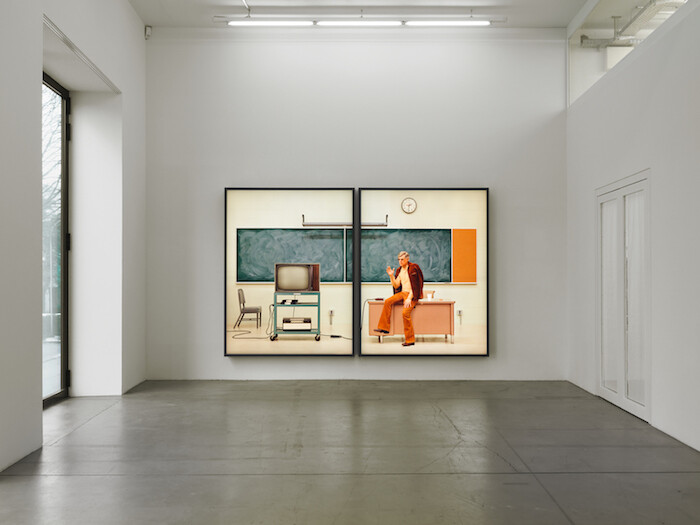 Graham has been active as a musician and artist for several decades, playing a key protagonist in his own pieces from the 1990s onwards. His looping film works, such as Photokinetoscope (2001) or Vexation Island (1997) have long been in the contemporary canon. His light-boxes, meanwhile, show chromogenic prints charged with color sandwiched between transparent surfaces, all the better to view images stuffed with detail. The exhibition’s title image, Media Studies ’77 (2016), is a diptych more than two meters tall and nearly four wide showing Graham posing as professor perched on a bent sheet steel desk in front of a blackboard, media trolley at the ready, a cigarette in the hand with which he emphasizes his point while looking right into the middle distance. His russet cords have a slight flare, a suede jacket drapes over his shoulders, and his glasses are tinted. The setting—painted breeze block walls, the clunky television remote, plug sockets—is North American but the figure (though inspired by one of Graham’s Vancouver lectures) is modeled on the French intellectuals of 1970s cinema, a heady time for a student keen to soak up continental influences.