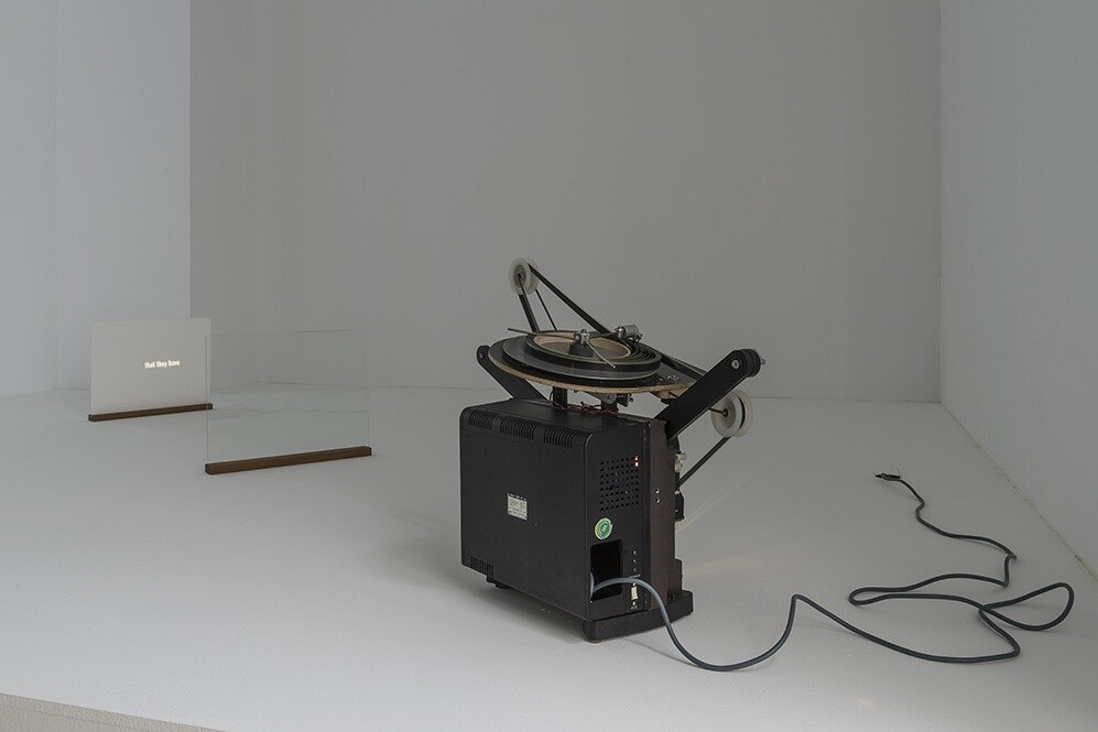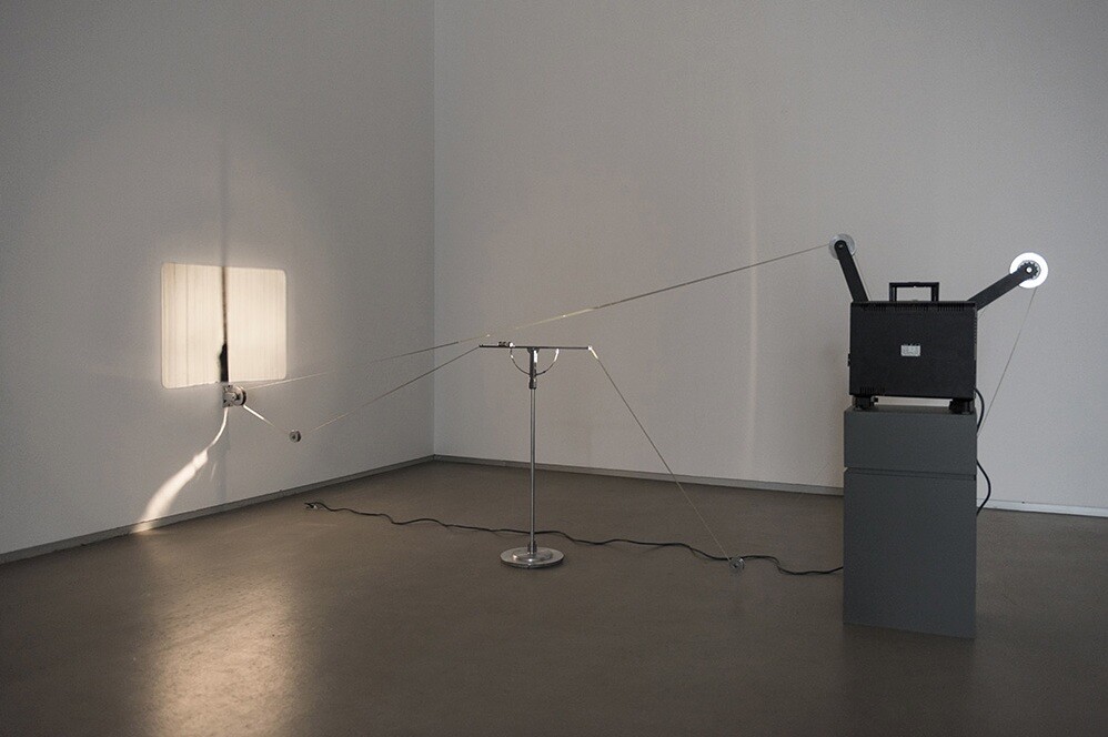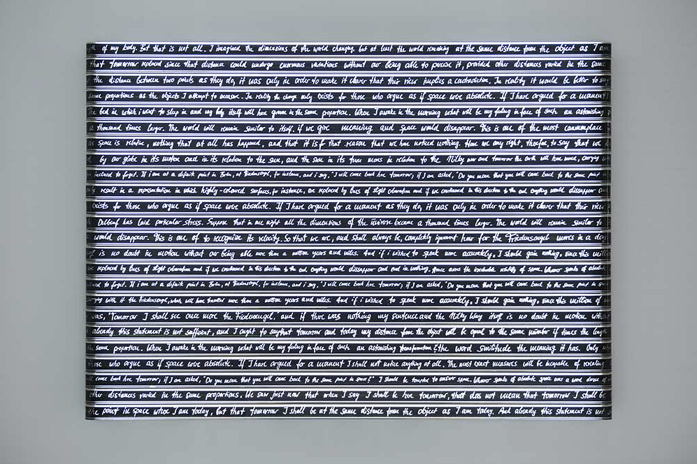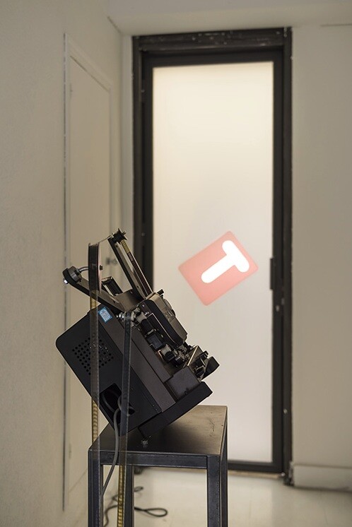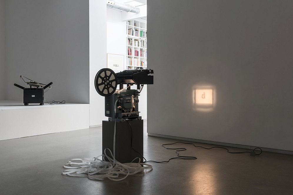 Spacelength Thought (2012)—an antique typewriter on top of a projector—types text onto 16mm white film. The slightly burned letters are projected one at a time onto the wall. While this “author” poetically extends the production time of each word on the wall, the printed film—on which the text could perhaps be read—piles up on the floor in a tangle. The old-fashioned projector in Focus Puller (2013) beams out a sentence, its focus alternating between the two glass screens that stand in front of it, constantly moving from one to the other in an effort to project a vivid image of the text. The sentence appears in focus for an instant, then blurred, as if this tireless attempt to focus were intended to evoke certain unstable or ephemeral thought processes. At the back of the room, sentences move at varying speeds across a screen made of horizontal lines of handwritten white text on black celluloid in Sight Enables Us to Appreciate Distance (2016). The pace is slow enough to keep us cross-reading, picking out words here and there, while the illuminated text slides along.