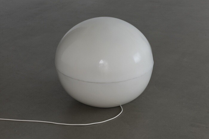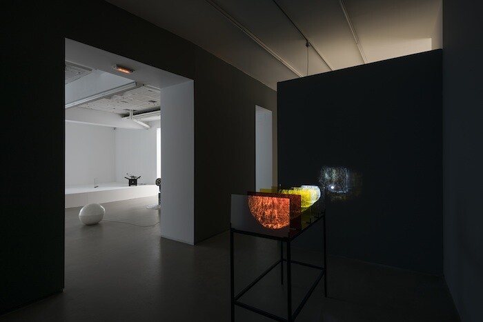 Rosa Barba is constantly reworking her pieces. Some works in the exhibition are the result of expanding her strategies and experience of site-specificity to indoor exhibition spaces. For her exhibition at the Centre international d’art et du paysage de l’île de Vassivière in France (“Is it a two-dimensional analogy or a metaphor?,” 2010), the artist placed a soundtrack in the lake, so that the acoustic waves were transmitted by the water and rippled its surface. Sat on the floor at the center of the main room at Parra & Romero, Conductor (2014)—a spherical object whose membrane is rhythmically deformed by sound—expands this investigation into the aural modulation of materials. The work has a more abstract presence than the surrounding mechanisms constructed out of projectors and celluloid, but like them it plays with the distance between subject and object.