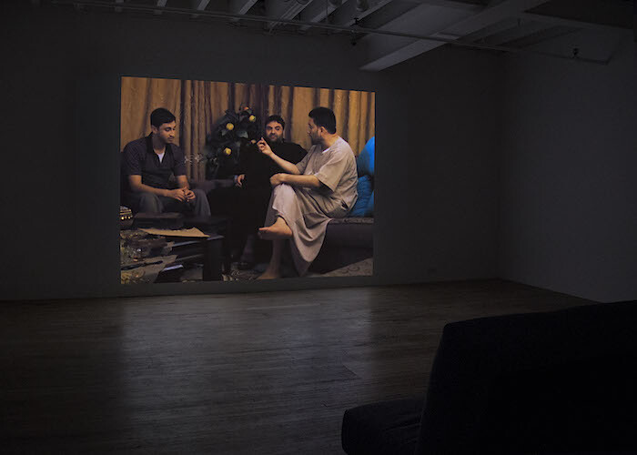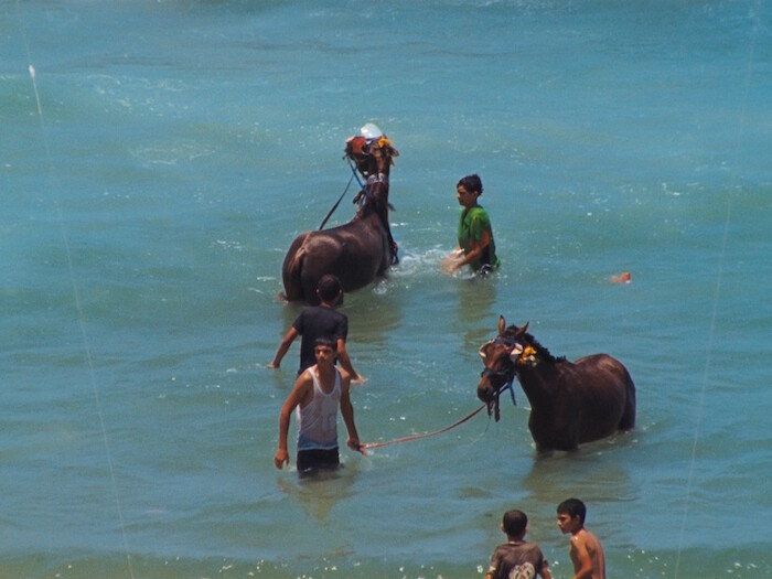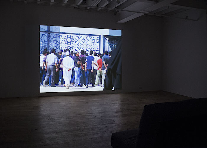 Nashashibi’s single-channel, 17-minute film Electrical Gaza (2015) plays on a loop in the gallery’s back room. Originally commissioned by the Imperial War Museum in London, the film documents a journey to Gaza in 2014 (after years of attempts to cross the closed border on the part of the artist, of mixed Irish and Palestinian heritage, and her small team) on the eve of Israel’s protracted bombardment, officially known as “Operation Protective Edge.” The resulting work is an impressionistic depiction of routine life in Gaza, accented by a score that mixes and intersperses field recording and ambient electronic and classical music, at times followed by jolting transitions into silence. These punctuations are straightforward and prominent compared to the cyclical visual editing. Sometimes similar scenes repeat themselves, like a memorable view of boys washing their horses in the sea, while others play best for effect once, such as a scene of men in a living room singing songs. Scenes of the noisy and desperate chaos of the border recur throughout. While hanging mostly at street-level, at times the view suddenly pans above the city, surveying it (or surveilling it). Pulling at the other end of the camera’s observational authority, some scenes transform into animations. This augments the images’ painterly quality, and gives a different, more maudlin feeling to the filmed scenes: the animations act as incursions on the authority of the image, and overlay an “unreal” sensory view over the camera eye, both complicating and overstating the original. In another intervention into the filmed image, a black hole expands into its space, resembling the “black moon” of cinematic processing, and an omen of the coming bombardments.