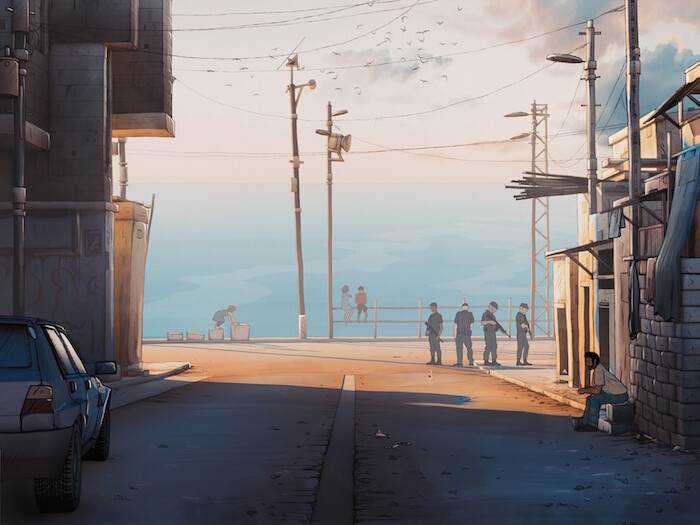 Are these paintings necessary to make the film seem more like an art thing, acting as a certified cover for the documentary work? Or is this a little dig to New York contemporary art audiences, in which the gallery-goers require the formal notes of the documentary to be explicated, so here are these handy paintings as a key to the art in the media? In either case, this pairing identifies respective weaknesses in documentary and contemporary art discourse as well as an intrinsic inability for either to communicate productively with the other. And in that case, the disturbance is a welcome one.