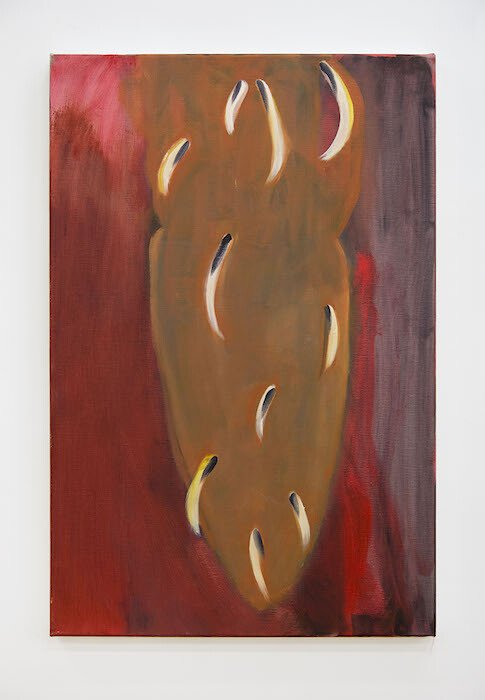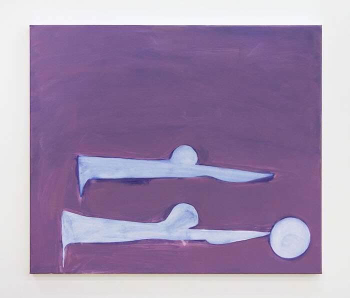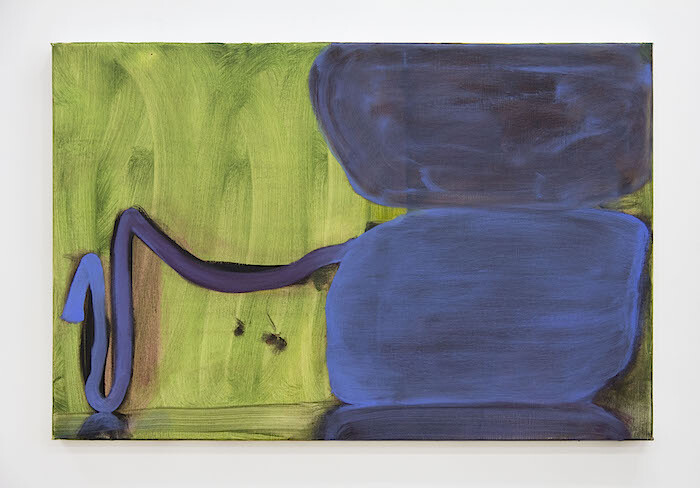 The other rooms of the gallery present a series of several new paintings by the artist. These works feature soft-edged forms that sometimes indicate bodily positions or objects at rest, while others are more deeply abstracted, suggesting, if anything, molecular forms or cells in motion. In one oil painting, titled Love and Violence (2016), two lightly blued parallel figures cut through a twilight horizon like a pair of swimmers in unison. A series of large gouache-on-paper works—X, and two works each titled The Hanging (all 2016)—depict cavities of animistic blobs. Regarding these, the attendant press release reads almost as a set of instructions, noting that paintings ”have a potential to disrupt focus and change the way in which the film is experienced, loosening its attachment to narrative or documentary.” Taking this cue, it does indeed become possible to project depictions from the film in the paintings and then go back to the film to inspect its formal plays and its color compositions over its social content. But what is this after, and what does it serve?