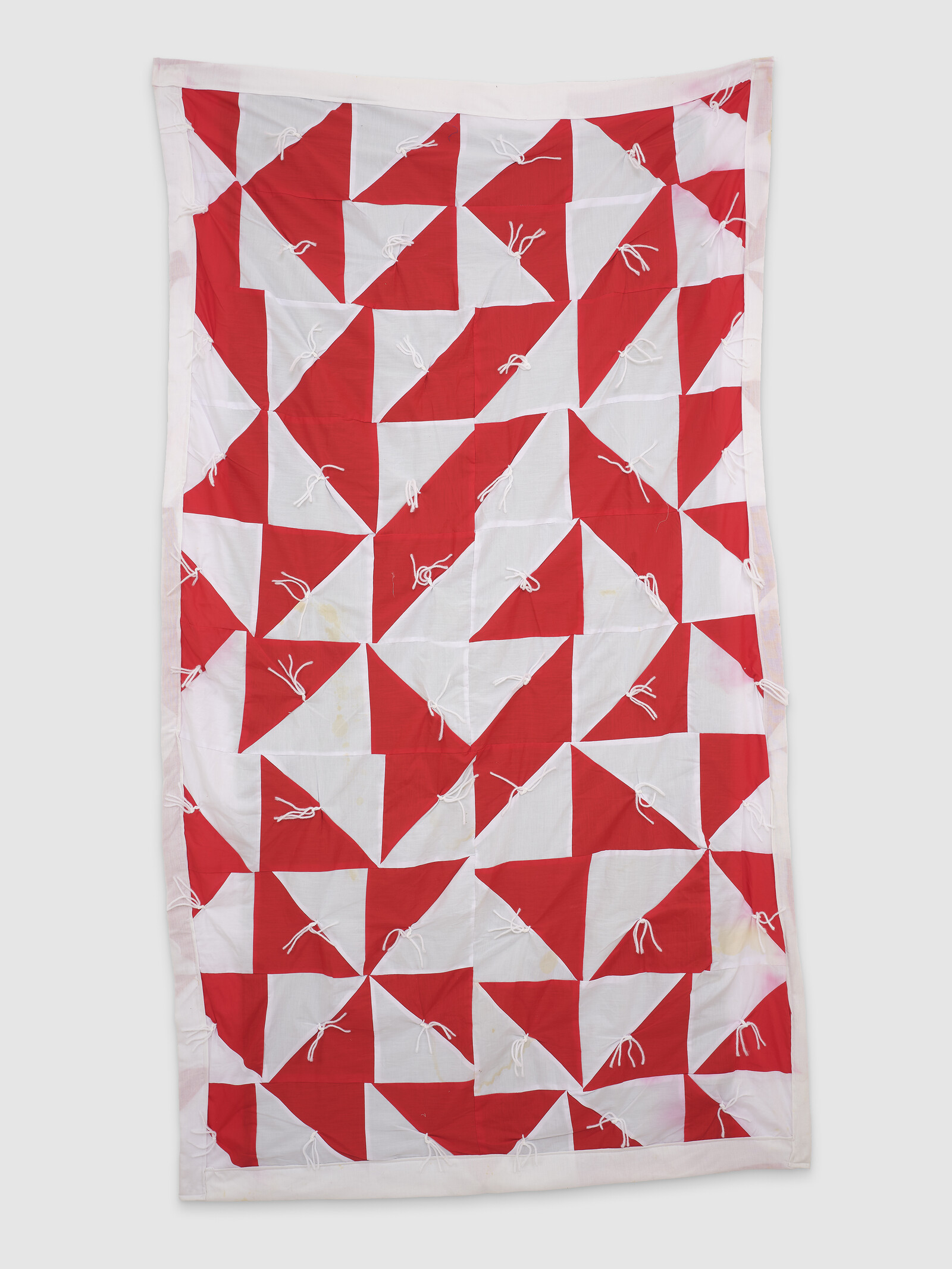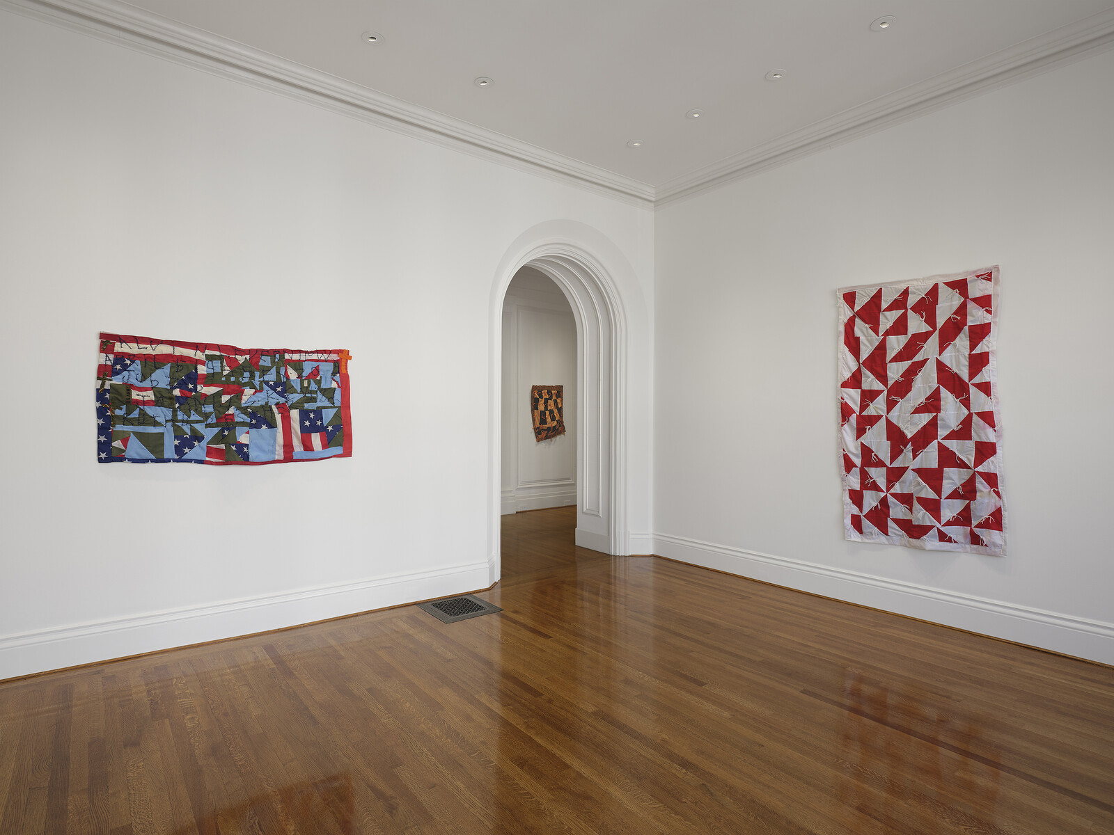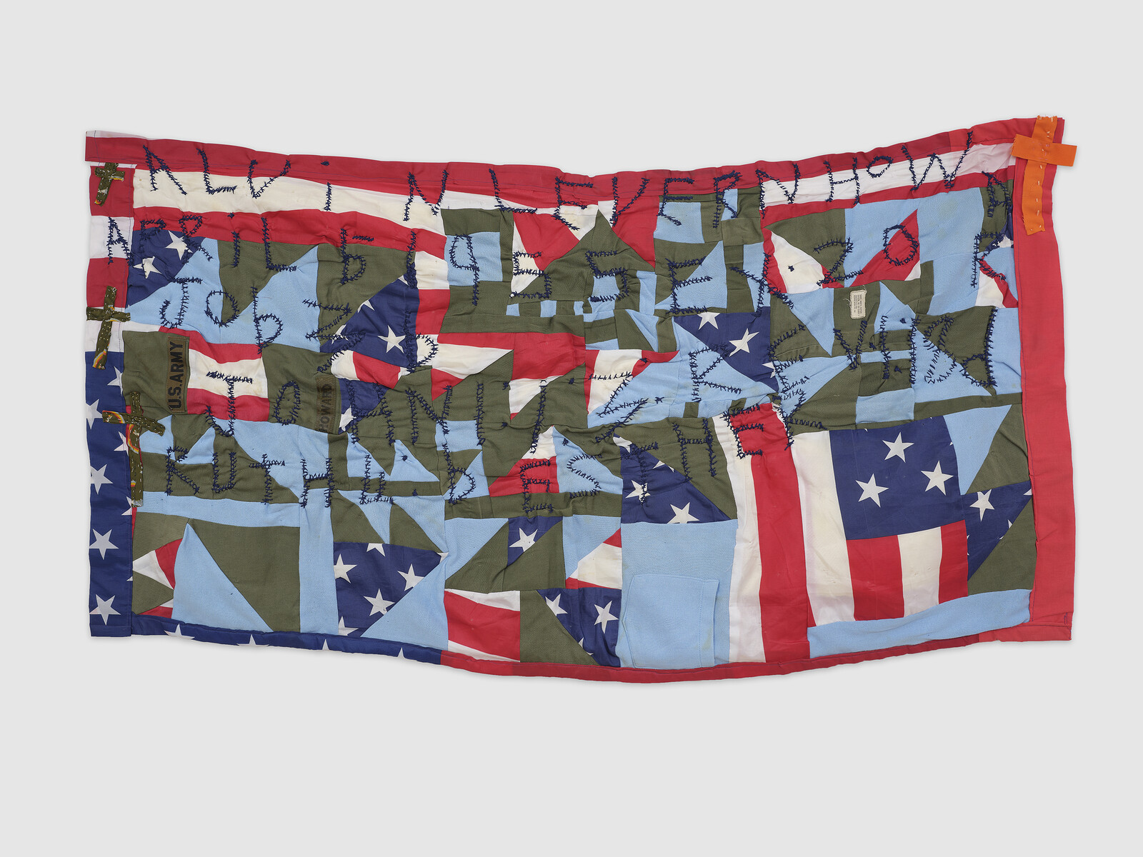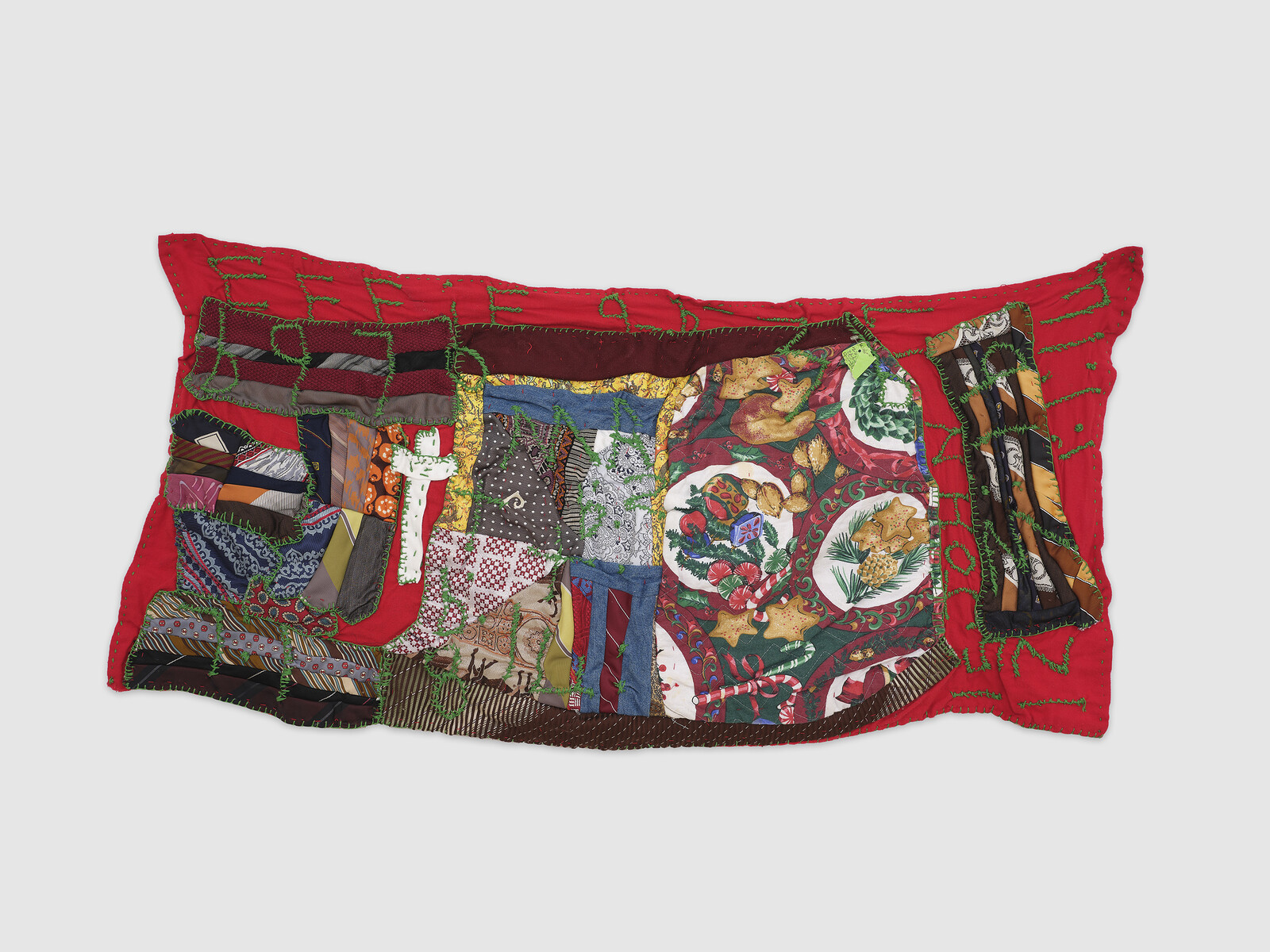 In the hallway, a horizontal quilt made between 2005 and 2006—less orderly than the first—incorporates silk ties in their traditional business palette, red cotton, slivers of denim, and a large piece of printed holiday fabric. Notes of biblical passages are embroidered in a shade that can only be described as “Christmas Green,” and a white cross is affixed, slightly off center. An incongruous element emerges upon close looking: a small bright green price tag that, at some point, by someone, was attached to the cookie fabric using a tagging gun and plastic barb. That the dangling accessory, typically yanked out of clothing, has been left in is a gesture at once playful and enigmatic.